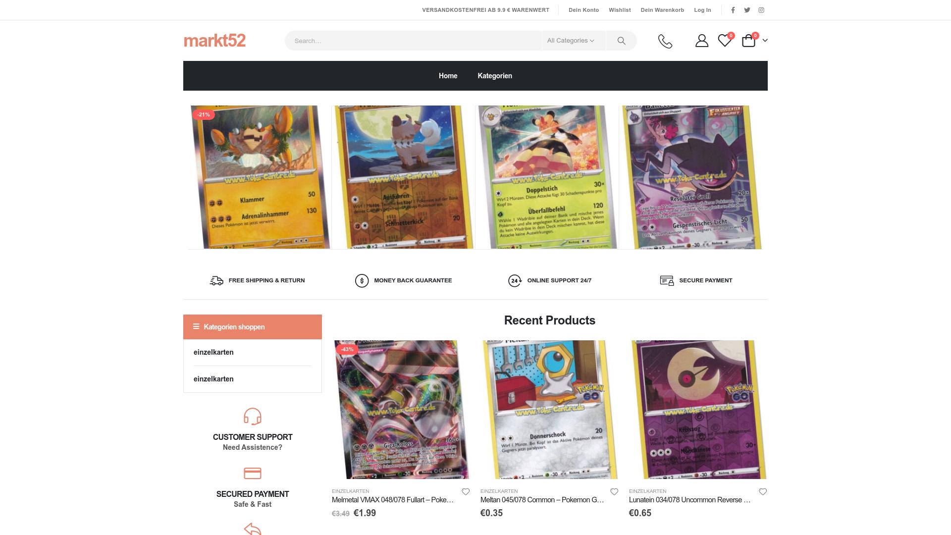 Die Webseite „markt52“ bietet eine Auswahl an Einzelkarten aus dem Pokémon-Kartenspiel zum Verkauf an. Die Startseite zeigt eine Vielzahl von Karten mit unterschiedlichen Designs und Seltenheitsgraden. Es werden spezielle Preisnachlässe auf einige Karten angezeigt, die in Prozent ausgewiesen sind. Die Karten sind nach verschiedenen Kriterien wie Kategorie und Aktualität geordnet. Eine Sektion auf der Webseite enthält Informationen zu den neuesten Produkten, dabei werden einzelne Karten mit ihren jeweiligen Preisen aufgelistet. Die Preise der Karten sind variabel und beginnen bei einem niedrigen Betrag von etwa 0,35 Euro. Es gibt auch einen sichtbaren Rabatt auf einige Artikel, der in Prozent angegeben ist. Die Webseite informiert die Nutzer darüber, dass der Versand kostenfrei ist, wenn ein Mindestbestellwert von 9,90 Euro erreicht wird. Zudem wird eine Geld-zurück-Garantie für die eingekauften Artikel angeboten, was bedeutet, dass Kunden möglicherweise die Möglichkeit haben, ihre Käufe zurückzugeben, falls sie nicht zufrieden sind. Ein Bereich für Kundenunterstützung ist ebenfalls vorhanden, der den Nutzern signalisiert, dass Hilfe verfügbar ist, falls Fragen oder Probleme auftreten. Die Seite hebt hervor, dass eine sichere Zahlungsmethode angeboten wird, um den Nutzern eine geschützte Transaktion zu ermöglichen. Zusätzlich wird ein 24/7-Onlinesupport angepriesen, was bedeutet, dass Kunden zu jeder Zeit Unterstützung anfordern können. Die Benutzeroberfläche der Webseite ist einfach gestaltet, mit einer klaren Navigation, die es den Nutzern ermöglicht, gezielt nach einzelnen Karten oder Kategorien zu suchen. Insgesamt bietet „markt52“ eine Plattform, auf der Nutzer Karten aus dem Pokémon-Universum erwerben können, wobei besondere Verkaufsaktionen und unterschiedliche Zahlungsmöglichkeiten erwähnt werden.