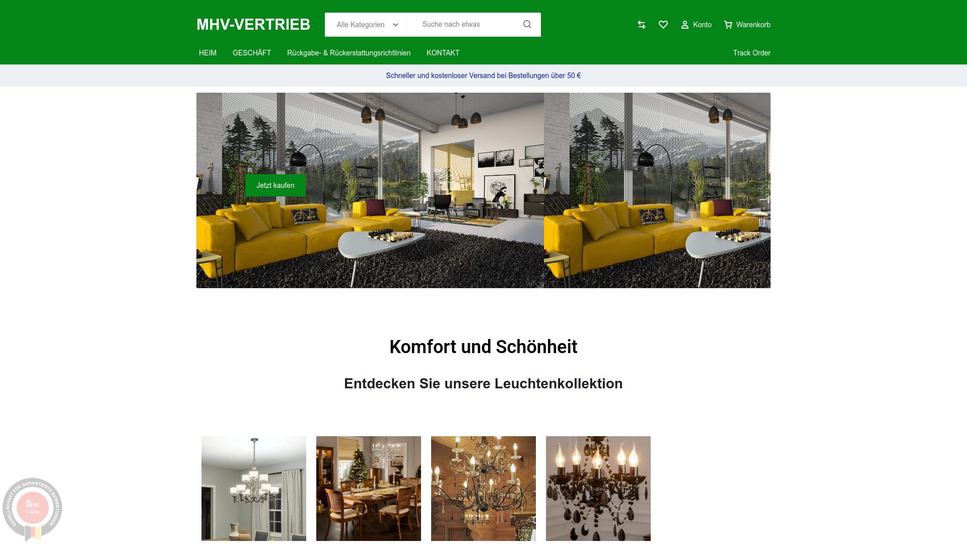 Die Webseite MHV-VERTRIEB bietet eine Auswahl an Wohn- und Einrichtungselementen, die vorrangig auf Komfort und Schönheit ausgerichtet sind. Im oberen Bereich der Seite ist ein Bild eines Wohnraums zu sehen, das eine gelbe Couch und eine moderne Innenarchitektur präsentiert. Diese visuelle Darstellung soll einen Eindruck von ansprechendem Wohnen vermitteln. Ein hervorstechendes Feature der Webseite ist der oben platzierte Button mit der Aufschrift „Jetzt kaufen“, der Besucher dazu anregt, die angebotenen Produkte direkt zu erwerben. Der Seiteninhalt konzentriert sich außerdem auf eine Leuchtenkollektion, die in einem speziellen Abschnitt hervorgehoben wird. Unter dem Titel „Komfort und Schönheit“ wird auf die Vielfalt des Angebots hingewiesen. Im unteren Abschnitt der Webseite sind mehrere Bilder von verschiedenen Beleuchtungskörpern abgebildet, die den Nutzern unter anderem Chandeliers und andere Arten von Leuchten präsentieren. Diese Bilder sind visuell ansprechend gestaltet und zeigen die Produkte in unterschiedlichen Umgebungen. Die Auswahl reicht von eleganten, klassisch gestalteten Leuchten bis hin zu moderneren Designs. Zusätzlich enthält die Webseite Links zu wichtigen Themen wie „Rückgabe- und Rückerstattungsrichtlinien“ sowie „Kontakt“, was darauf hindeutet, dass Kunden Informationen zu ihren Bestellungen erhalten und bei Bedarf Unterstützung anfordern können. Die Nutzer haben auch Zugang zu verschiedenen Kategorien, die vermutlich eine größere Produktpalette umfassen, auch wenn diese im aktuellen Screenshot nicht weiter spezifiziert sind. Die Hauptnavigationsleiste der Webseite ermöglicht eine einfache Suche nach spezifischen Artikeln und Angeboten, was die Benutzererfahrung verbessern soll. Insgesamt zielt die Webseite darauf ab, eine Plattform zu bieten, auf der Nutzer verschiedene Produkte für ihre Wohnung finden können, wobei das Hauptaugenmerk auf stylischen und funktionalen Beleuchtungselementen liegt.
