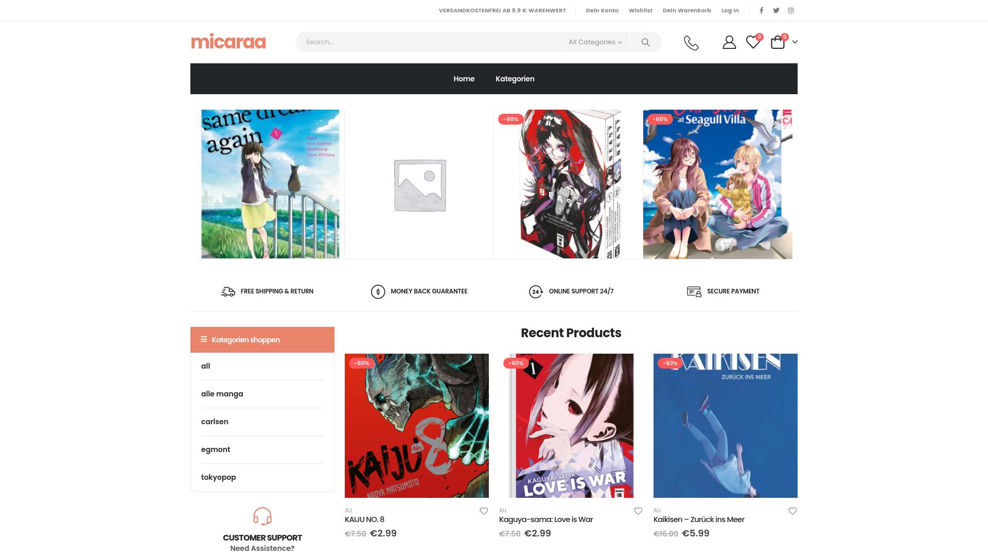 Die Webseite micaraa bietet eine Auswahl an Manga und Comics zum Verkauf an. Die Startseite zeigt eine Vielzahl von Produkten, darunter verschiedene Manga-Titel, wobei einige Artikel mit prozentualen Rabatten gekennzeichnet sind, die den Käufer auf die Ersparnis hinweisen. Der Fokus liegt auf Genre- und Titelvielfalt, und die Produkte scheinen detailliert beschrieben zu sein, sodass Nutzer spezifische Informationen zu jedem Titel erhalten können. Die Kategorien auf der Webseite ermöglichen es den Nutzern, gezielt nach bestimmten Manga-Verlagen oder -Genres zu suchen. Zu diesen Kategorien gehören Optionen wie „alle Manga“, „carlsen“, „egmont“ und „tokyopop“, was darauf hindeutet, dass ein breites Spektrum an Anbietern abgedeckt wird. Es sind auch spezielle Angebote oder weitverbreitete Titel zu finden, die möglicherweise für eine breite Käufergruppe interessant sind. Darüber hinaus weist die Webseite darauf hin, dass kostenloser Versand und Rücksendungen angeboten werden, wenn ein bestimmter Warenwert erreicht ist. Dies könnte potenziell die Nutzererfahrung verbessern, indem es keine zusätzlichen Versandkosten für Käufer im Rahmen ihrer Bestellungen gibt. Des Weiteren wird eine Rückerstattungsgarantie erwähnt, was darauf hindeutet, dass Kunden im Falle von Problemen Rücksendungen vornehmen können. Zusätzlich sind Hinweise auf einen 24/7 Kundenservice zu finden, der Unterstützung bietet. Dies kann als Ressource für Käufer angesehen werden, die Fragen oder Anliegen zu ihren Bestellungen haben. Auf den Produktkarten sind teilweise auch Miniaturansichten der Titel sowie Preisangaben sichtbar, die den Nutzern helfen, eine informierte Kaufentscheidung zu treffen. Die Webseite verwendet eine einfache und übersichtliche Benutzeroberfläche, die den Nutzer durch die verschiedenen Kategorien und Produkte navigieren lässt. Such- und Filteroptionen scheinen vorhanden zu sein, um gezielt durch die Angebote zu stöbern. Die visuellen Elemente und die Darstellung der Inhalte legen den Fokus auf die Produkte, während die allgemeine Gestaltung der Seite Informationen klar und strukturiert präsentiert.