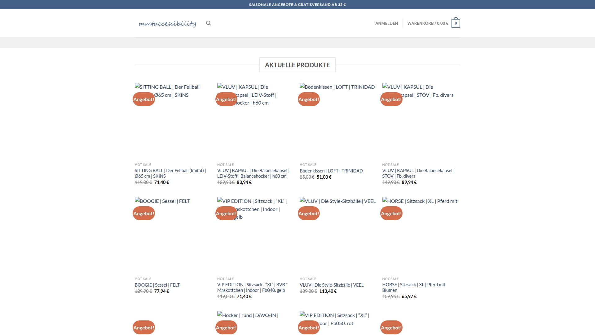 Die Webseite bietet eine Auswahl an verschiedenen Produkten im Bereich Sitzmöbel und Komfortartikel an. Zu den Hauptprodukten zählen Sitzbälle, Balancekapseln und Sessel, die für unterschiedliche Einsatzmöglichkeiten konzipiert sind. Die Artikel sind in verschiedenen Ausführungen und Größen erhältlich, darunter Modelle wie „Sitting Ball“ mit einem Durchmesser von 65 cm, der als Imitat angeboten wird, sowie eine Reihe von Balancekapseln namens „VLUV KAPSUL“, die in unterschiedlichen Farben und Designs erhältlich sind. Weiterhin werden Sessel und Sitzsäcke wie der „BOOGIE Sessel“, der in einem Filzmaterial angeboten wird, gelistet. Diese Produkte sind für den Innenbereich vorgesehen. Des Weiteren zeigt die Seite spezielle Angebote und reduzierte Preise für einige Artikel, beispielsweise wird der „Sitting Ball“ ursprünglich für 119,00 € angeboten, aber zu einem reduzierten Preis von 71,40 € beworben. Ähnliche Preisreduzierungen finden sich auch bei den anderen Produkten, was darauf hindeutet, dass die Webseite aktiv Verkaufsaktionen durchführt. Nebenbei wird auch die Kategorie „Hot Sale“ hervorgehoben, die besonders reduzierte Produkte präsentiert. Zusätzlich sind die Artikel mit verschiedenen Bezeichnungen versehen, die auf besondere Eigenschaften oder Materialien hinweisen, wie „LEIV-Stoff“ oder „Indoor“. Die Markenauswahl umfasst unter anderem Produkte von „SKINS“, „LOFT“ und „VEEL“, die durch ihre unterschiedlichen Designs und Zwecke den Kunden eine Auswahl bieten. Die Benutzeroberfläche der Webseite umfasst einen Suchbereich sowie die Möglichkeit, sich anzumelden und einen Warenkorb zu nutzen. Die Seite könnte auch saisonale Angebote kommunizieren, was durch den Hinweis auf „saisonale Angebote“ im oberen Bereich unterstützt wird. Insgesamt scheint die Webseite darauf ausgelegt zu sein, eine Vielzahl von Sitz- und Komfortprodukten anzubieten, jedoch bleibt unklar, wie die langfristigen Rahmenbedingungen der Angebote beschaffen sind oder welche weiteren Dienstleistungen eventuell zur Verfügung stehen.
