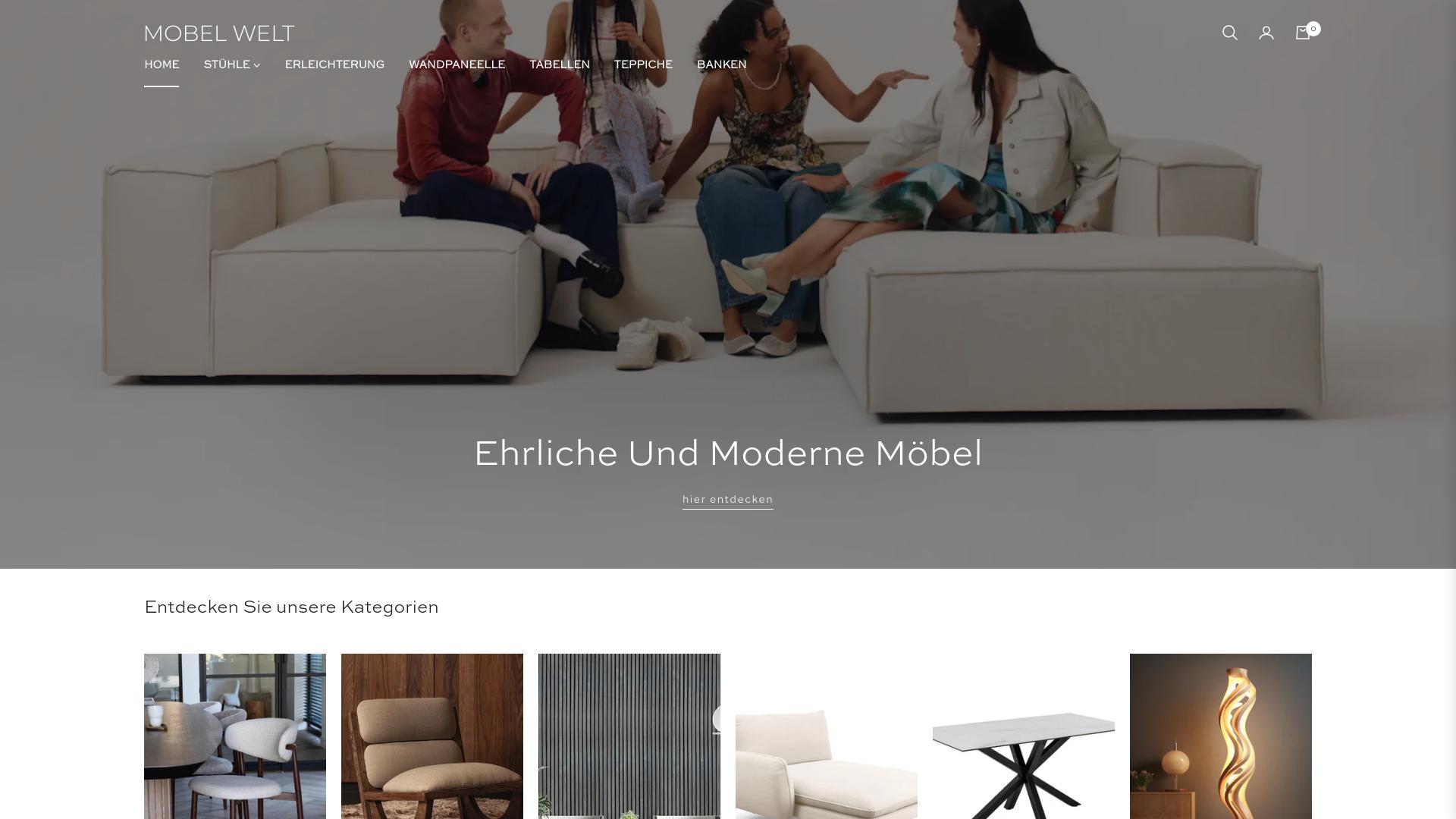 Die Webseite „MOBEL WELT“ präsentiert eine Auswahl an Möbeln und Einrichtungsgegenständen. Der Betrachter wird zu Beginn von einem Bild begrüßt, das eine Gruppe von Personen zeigt, die sich in einem modernen Wohnraum versammeln und auf einem Lounge-Möbelstück sitzen. Dies vermittelt einen informellen und geselligen Eindruck des Wohnens. Die Hauptnavigation der Seite umfasst verschiedene Kategorien, darunter „Stühle“, „Erleuchtung“, „Wandpaneele“, „Tabellen“, „Teppiche“ und „Bänken“. Die Kategorien deuten darauf hin, dass die Webseite ein umfassendes Angebot an Einrichtungsgegenständen für unterschiedliche Wohnbedürfnisse bereitstellt. Unter dem Hauptbanner ist ein kurzer Text platziert, der die Besucher auffordert, „ehrliche und moderne Möbel“ zu entdecken. Diese Formulierung könnte darauf hinweisen, dass die Webseite sich auf zeitgenössische Designs fokussiert. Darüber hinaus werden in einer Galerie die verschiedenen Produktkategorien visuell angezeigt. Zu sehen sind unter anderem Abbildungen von Stühlen, Tischmodellen, Lampen und Teppichen, die eine Auswahl an Materialien und Designs vorstellen. Die Bilder zeigen Möbel in verschiedenen Stilen, von modern bis klassisch, was auf ein vielfältiges Produktsortiment schließt. Die Website gibt keine detaillierten Informationen zu Preisen, Zahlungsbedingungen oder Lieferoptionen an. Die Benutzer könnten vermuten, dass diese Informationen möglicherweise kryptisch oder differenziert verfügbar sind, wenn sie weiter in die von der Seite bereitgestellten Optionen eintauchen. Zusammenfassend bietet die Webseite MOBEL WELT eine Plattform zur Erkundung und gegebenenfalls zum Erwerb von Möbeln und Einrichtungsgegenständen in verschiedenen Kategorien. Der visuelle Inhalt und die angebotenen Produkte sind auf ein modernes Wohnambiente ausgerichtet. Die Informationen sind auf den ersten Blick klar strukturiert, aber es fehlen möglicherweise spezifische Details, die für einen Kaufentscheid von Bedeutung sein könnten.