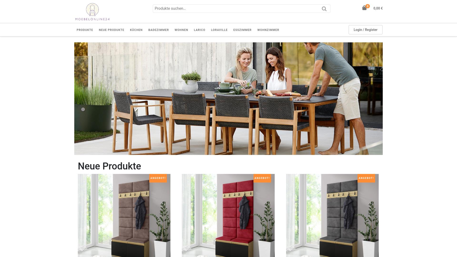 Die Webseite moebelonline24 bietet eine Auswahl an Möbeln für verschiedene Wohnbereiche. Die Hauptkategorien umfassen Produkte für Küchen, Esszimmer, Wohnzimmer, Badezimmer und spezielle Bereiche wie Larico und Loraville. Auf der Startseite wird eine Bildpräsentation angezeigt, die eine Gruppe von Personen zeigt, die an einem Holztisch mit bequemen Stühlen sitzen und gemeinsam essen. Diese Darstellung könnte die Funktion der Seite als Plattform für den Kauf von Möbeln und Einrichtungsgegenständen in einem geselligen Kontext unterstreichen. Im unteren Bereich der Seite werden neue Produkte vorgestellt, darunter verschiedene Modelle von Garderoben oder Sitzbänken, die in unterschiedlichen Farbvarianten wie Rot, Braun und Grau angeboten werden. Diese Produkte scheinen darauf ausgelegt zu sein, sowohl funktionale als auch ästhetische Bedürfnisse zu erfüllen. Einige dieser Artikel sind mit dem Hinweis „Angebot“ gekennzeichnet, was darauf hindeutet, dass sie zu reduzierten Preisen erhältlich sein könnten. Die Benutzeroberfläche der Seite scheint klar strukturiert zu sein, mit einer einfachen Navigation, die es Nutzern ermöglicht, verschiedene Produktkategorien zu durchsuchen. Auch eine Suchfunktion ist vorhanden, die es ermöglicht, gezielt nach bestimmten Artikeln zu suchen. Die Gesamtpräsentation der Webseite legt Wert auf eine visuelle Darbietung und eine benutzerfreundliche Erfahrung, um den Prozess des Möbelkaufs zu unterstützen. Es gibt außerdem eine Registrierungsmöglichkeit für Benutzer, die es ihnen erlaubt, ein persönliches Konto zu erstellen. Der Warenkorb wird ebenfalls angezeigt, was anzeigt, dass Einkäufe online getätigt werden können. Diese Aspekte könnten darauf abzielen, den Einkauf von Möbeln und Einrichtungsgegenständen zu erleichtern. Die Webseite ist darauf ausgelegt, vielfältige Möbeloptionen anzubieten, die unterschiedliche geschmackliche und funktionale Anforderungen bedienen. Die dargestellten Produkte scheinen für unterschiedliche Räume geeignet zu sein und bieten den Nutzern eine Auswahl, um ihre Wohnräume nach eigenen Vorstellungen zu gestalten.