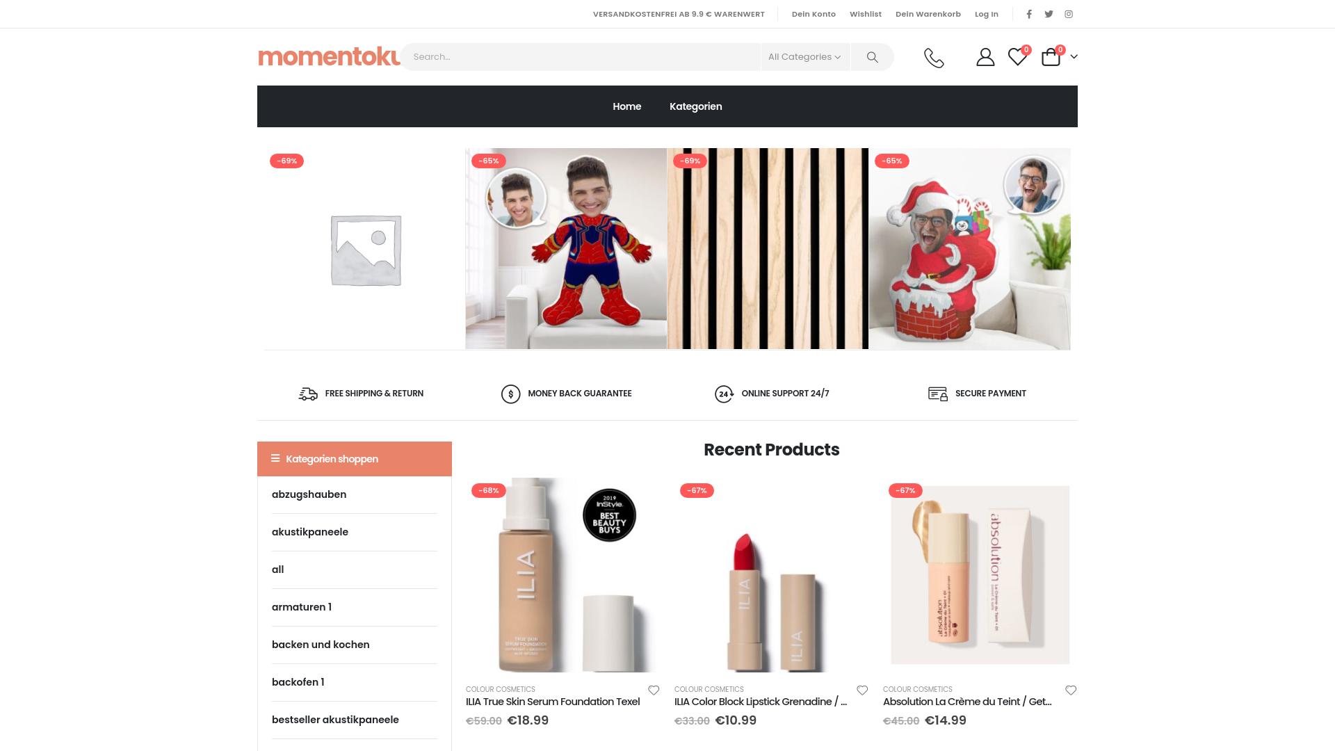 Die Webseite „momentokul“ bietet eine Vielzahl von Produkten an, die in verschiedene Kategorien unterteilt sind. Die Hauptangebote umfassen personalisierte Artikel, wie beispielsweise Figuren mit individuellen Fotodrucken sowie verschiedene Akustikpaneele. Die Produkte scheinen auf eine Kombination aus Wohnaccessoires und kosmetischen Artikeln abzuzielen. Im oberen Bereich der Webseite sind einige ausgeprägte Angebote hervorgehoben, darunter personalisierte Figuren, die in verschiedenen Designs verfügbar sind. Dazu zählen unter anderem festliche Figuren, die einen weihnachtlichen Bezug haben. Es werden signifikante Rabatte angezeigt, die auf die Ersparnisse hinweisen, die beim Kauf bestimmter Produkte erzielt werden können. Die Kategorien im Menü umfassen unter anderem „Abzugshauben“, „Akustikpaneele“ sowie „Backen und Kochen“. Diese Kategorien deuten darauf hin, dass die Webseite sowohl Haushaltsgeräte als auch Einrichtungslösungen bietet. Unter den kürzlich hinzugefügten Produkten finden sich Kosmetikartikel, wie beispielsweise das „ILIA True Skin Serum Foundation Texel“ und „ILIA Color Block Lipstick Grenadine“. Auch hier sind Preisnachlässe zu erkennen, die auf eine temporäre Preisreduktion hinweisen. Zusätzlich wird auf der Seite eine „Money Back Guarantee“ bereitgestellt, die eine Rückgabemöglichkeit für die Kunden signalisiert, sowie ein 24/7 Online-Support, der die Erreichbarkeit des Kundendienstes unterstreicht. Weiterhin wird kostenfreier Versand ab einem bestimmten Bestellwert angeboten, was ebenfalls einen Anreiz für Kunden darstellen könnte. Insgesamt bietet die Webseite eine Mischung aus persönlichen, dekorativen und kosmetischen Produkten an, die sowohl für den persönlichen Gebrauch als auch potenziell für Geschenke geeignet sind. Die Präsentation der Produkte wird durch visuelle Elemente unterstützt, die eine ansprechende und catchige Gestaltung vermitteln sollen.