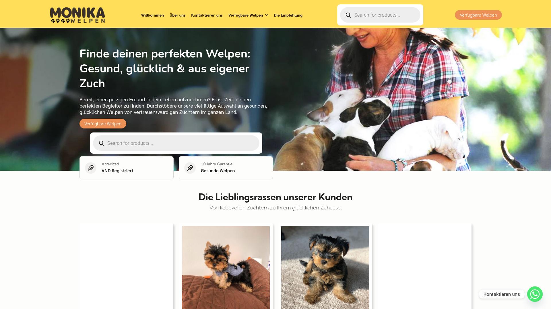 Die Webseite „Monika Welpen“ bietet eine Plattform zur Suche und zum Erwerb von Welpen aus verschiedenen Zuchtstätten. Sie richtet sich an Interessenten, die einen Hund als Haustier aufnehmen möchten. Auf der Startseite wird ein einladender Text präsentiert, der Nutzer dazu ermutigt, ihren idealen Begleiter zu finden. Es werden Welpen von angeblich vertrauenswürdigen Züchtern in ganz Deutschland angeboten. Die Benutzeroberfläche enthält eine Suchfunktion, die es Nutzern ermöglicht, gezielt nach verfügbaren Welpen zu suchen. Zudem sind verschiedene Kategorien oder Rassen auf der Seite zu finden, zusammen mit Bildern und Informationen zu den Züchtern. Der Slogan auf der Webseite hebt das Wohlbefinden der Tiere hervor, jedoch bietet die Seite keine spezifischen Informationen über die Zuchtstandards oder die Gesundheitsüberprüfungen der angebotenen Welpen. Es gibt einen Abschnitt, der den Nutzern die beliebtesten Rassen darstellt, die von anderen Kunden ausgewählt wurden. Diese Bilder zeigen junge Hunde in unterschiedlichen Positionen und Umgebungen. Zudem wird ein Hinweis auf eine Registrierung (VND) eingeblendet, jedoch bleibt unklar, was diese Registrierung konkret bedeutet. Die Webseite legt auch eine zehnjährige Garantie auf die Gesundheit der Welpen dar, ohne weiter auf die Bedingungen oder den Umfang dieser Garantie einzugehen. Ein Kontaktpunkt über WhatsApp wird bereitgestellt, um potenziellen Käufern die Kontaktaufnahme zu erleichtern, was darauf hindeutet, dass Nutzer direkt mit dem Anbieter kommunizieren können. Insgesamt präsentiert sich die Webseite als Plattform für Hundeliebhaber, die auf der Suche nach einem Welpen sind, ohne jedoch detaillierte Informationen über die Züchter, die Zuchtmethoden oder die rechtlichen Aspekte des Kaufes anzubieten. Es werden keine spezifischen Informationen zu Preisen oder Zahlungsmodalitäten dargestellt.