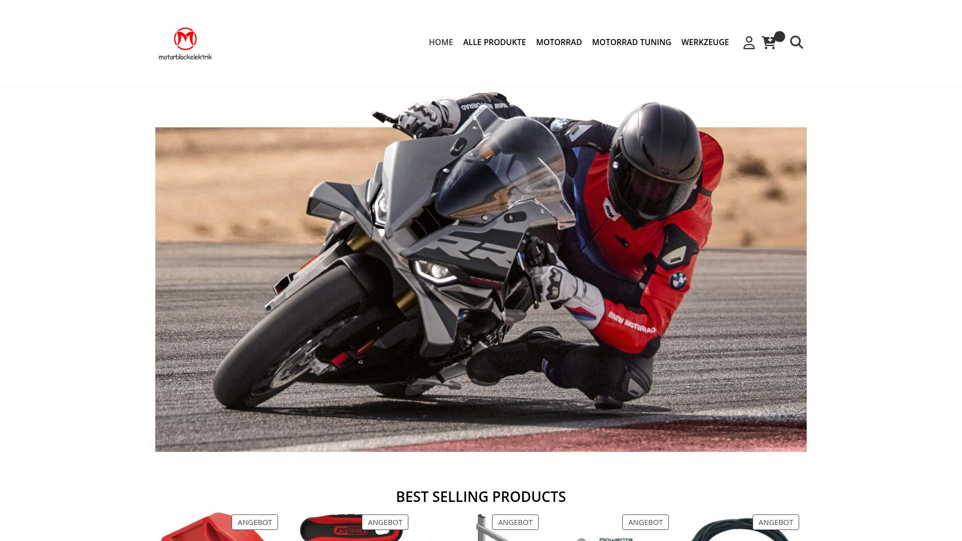 Die Webseite motorblockelektrik bietet eine Vielzahl von Produkten und Dienstleistungen, die hauptsächlich auf den Bereich Motorräder ausgerichtet sind. Die Startseite zeigt ein Header-Bild, das einen Motorradfahrer in Aktion darstellt, was auf die thematische Ausrichtung der Seite hinweist. Im oberen Navigationsbereich sind verschiedene Kategorien aufgelistet, darunter „Home“, „Alle Produkte“, „Motorrad“, „Motorrad Tuning“ und „Werkzeuge“. Diese Struktur deutet darauf hin, dass die Webseite eine umfassende Auswahl an Motorradzubehör und -teilen bereithält, die für Motorradenthusiasten von Interesse sein könnten. Unter dem Abschnitt „Best Selling Products“ sind verschiedene Produkte aufgelistet, die als beliebte Artikel hervorgehoben werden. Die Abbildung zeigt eine Auswahl von Werkzeugen und Zubehörteilen, die für die Wartung oder den Tuning eines Motorrads verwendet werden können. Es scheint, dass die Webseite Kunden eine Vielzahl an nützlichen Werkzeugen zur Verfügung stellt, um die Leistungsfähigkeit ihrer Motorräder zu verbessern oder Reparaturen vorzunehmen. Die Kategorie „Motorrad Tuning“ könnte spezifische Produkte umfassen, die darauf abzielen, die Leistung von Motorrädern zu optimieren oder individuelle Anpassungen durchzuführen. Dies spricht wahrscheinlich Motorradbesitzer an, die an Leistungssteigerungen oder persönlichen Modifikationen ihrer Fahrzeuge interessiert sind. Zusätzlich wird die Möglichkeit angeboten, Produkte über die Webseite zu erwerben, was durch eine Einkaufsfunktionalität, dargestellt durch ein Warenkorb-Symbol, unterstützt wird. Hinweise auf Angebote oder spezielle Preisaktionen sind nicht explizit sichtbar, jedoch könnte dies Teil des Gesamtangebots der Seite sein. Insgesamt präsentiert sich die Webseite als Plattform, die darauf abzielt, benutzerfreundliche Zugänge zu Produkten für Motorradliebhaber zu schaffen, wobei der Fokus auf Werkzeugen, Zubehör und möglicherweise spezifischen Tuning-Lösungen liegt. Es ist jedoch keine detaillierte Information über die einzelnen Produkte oder deren spezifische Merkmale zu finden, was eine tiefere Recherche oder Benutzerfragen erfordern könnte.