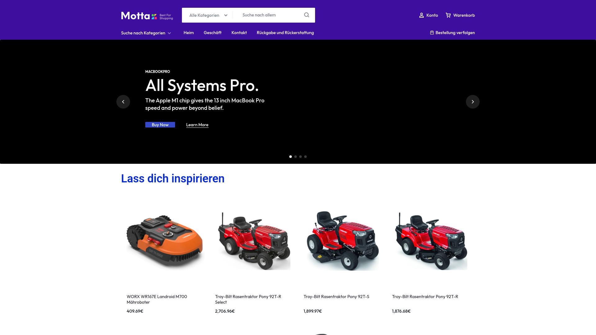 Die Webseite bietet eine Vielzahl von Produkten im Bereich Garten- und Heimtechnik an. Im Fokus stehen verschiedene Gartengeräte, darunter Rasenmäher und Mähroboter. Beispielsweise wird der WORX WR167E Landroid M700 Mähroboter zu einem Preis von 409,69 Euro angeboten. Des Weiteren werden mehrere Modelle von Rasenmähern der Marke Troy-Bilt präsentiert, die zwischen 1.876,68 Euro und 2.706,96 Euro kosten. Die Seite ist übersichtlich gestaltet und ermöglicht eine einfache Navigation durch verschiedene Kategorien. In der oberen Menüleiste finden sich Optionen, um nach Produkten zu suchen, sowie Links zu Kontoinformationen, dem Warenkorb und weiteren nützlichen Seiten wie Rückgabe und Rückerstattung. Zusätzlich wird ein MacBook Pro beworben, das mit dem Apple M1 Chip ausgestattet ist und mit der Beschreibung „All Systems Pro“ versehen wird. Dies deutet auf eine Zielgruppe hin, die an technischen Geräten interessiert ist. Neben der Möglichkeit, Produkte zu kaufen, wird auch eine Funktion zur Verfolgung von Bestellungen angeboten. Die insgesamt ansprechende Gestaltung der Webseite und die Darstellung der Produkte spricht eine breite Nutzerbasis an, die sich für Gartenpflege und moderne technische Geräte interessiert. Die Angebote werden mit Preisen in Euro angezeigt, was auf eine Zielgruppe im deutschen Sprachraum hindeutet. Die Seite könnte für Nutzer, die Rasenpflegegeräte oder technische Geräte suchen, von Interesse sein. Die Gestaltung und die Produktauswahl spiegeln aktuelle Trends im Bereich Gartentechnik wider. Sie enthält verschiedene Informationen zu den Produkten, jedoch keine spezifischen Details zur Garantie oder zu etwaigen Kundenbewertungen, was für Interessierte von Bedeutung sein könnte.