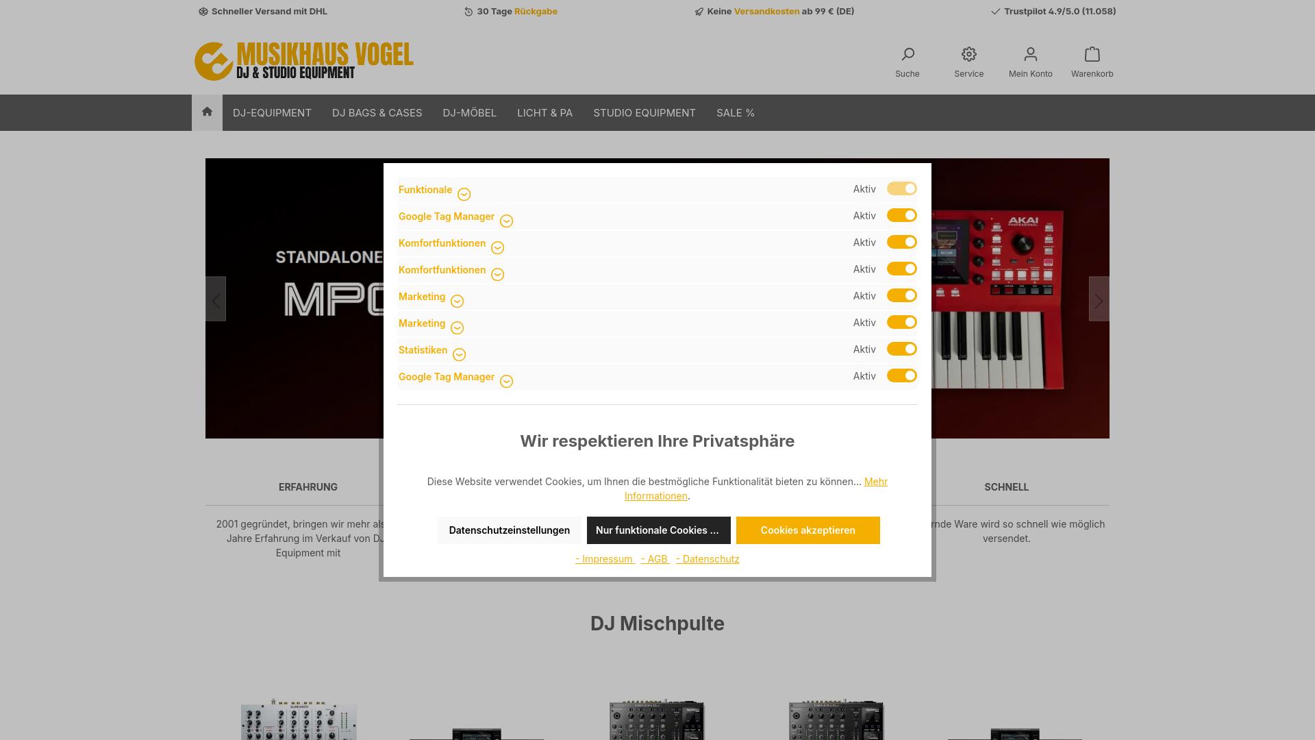 Die Webseite „Musikhaus Vogel“ bietet eine Auswahl an DJ- und Studioequipment an. Die Produktkategorien umfassen verschiedene Arten von DJ-Equipment, DJ Bags und Cases, DJ-Möbel, Licht- und PA-Technik sowie Studio-Equipment. Auf der Seite werden verschiedene Produkte präsentiert, darunter Mischpulte, MIDI-Controller und andere Audiogeräte, die für DJs und Musikproduzenten geeignet sind. Ein besonderes Augenmerk liegt auf der Benutzerfreundlichkeit der Webseite, die einen einfachen Zugriff auf die angebotenen Produkte ermöglicht. Es wird eine Vielzahl von Produkten aus unterschiedlichen Preisklassen und Marken angeboten. Nutzer können während des Surfens durch die Kategorien navigieren, um gezielt nach bestimmten Geräten zu suchen. Die Webseite scheint auch Informationen über die Erfahrungen des Unternehmens zu enthalten, die seit 2001 im Geschäft ist und über eine große Auswahl an Audioequipment verfügt. Ein Bereich der Webseite ist den Versanddetails gewidmet, der angibt, dass der Versand schnell erfolgt und unter bestimmten Bedingungen keine Versandkosten anfallen. Es gibt zusätzliche Angaben zu Rückgaberechten und allgemeinen Geschäftsbedingungen, die den Nutzern helfen sollen, sich über ihre Kaufmöglichkeiten zu informieren. Darüber hinaus informiert die Webseite die Besucher über die Verwendung von Cookies und bietet Optionen zur Datenverarbeitung an. Es werden verschiedene Marketing- und Analyse-Tools erwähnt, um die Nutzererfahrung zu optimieren. Die Webseite legt dar, dass die Privatsphäre der Besucher respektiert wird und bietet Optionen zur Anpassung der Cookie-Einstellungen an. Insgesamt bietet die Webseite eine klare Struktur, um den Nutzern den Zugang zu verschiedenen Produkten im Bereich DJ- und Studioequipment zu erleichtern.