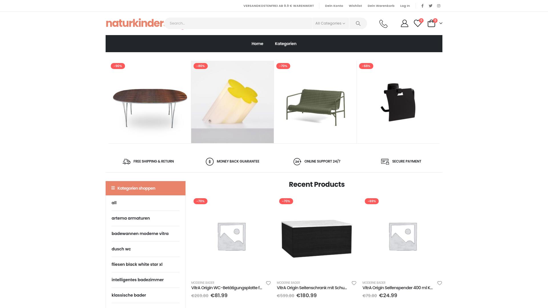 Die Webseite „naturkinder“ bietet eine Vielzahl von Produkten an, die hauptsächlich in den Kategorien Möbel, Badezimmerbedarf und Wohnaccessoires eingeordnet sind. Nutzer haben die Möglichkeit, durch verschiedene Kategorien zu navigieren, um die Angebote leicht zu finden. Auf der Startseite wird eine Auswahl an Artikeln präsentiert, darunter ein Tisch, eine dekorative Lampe, eine Gartenbank und verschiedene Badezimmerelemente. Es wird hervorgehoben, dass Produkte mit erheblichen Rabatten angeboten werden, die bis zu 90 % betragen. Zusätzlich sind Informationen über die Versandkosten und die Rückgabepolitik sichtbar, die darauf hinweisen, dass der Versand ab einem bestimmten Warenwert kostenfrei ist und eine Geld-zurück-Garantie angeboten wird. Die Webseite betont auch die Verfügbarkeit von Kundenservice rund um die Uhr, was darauf hindeutet, dass Nutzer jederzeit Unterstützung erhalten können. Die Produktübersicht umfasst sowohl moderne als auch klassische Designs und deckt Bereiche wie Badezimmermöbel, Armaturen sowie weitere Wohnaccessoires ab. Die Preise für die Artikel variieren, wobei einige Produkte als Rabattaktionen angezeigt werden, was die Preisgestaltung der Angebote für Nutzer attraktiv erscheinen lässt. In der seitlichen Menüleiste sind spezifische Kategorien wie „Moderne Bäder“ und „Intelligentes Badezimmer“ aufgelistet, die es Benutzern ermöglichen, gezielt nach bestimmten Produktgruppen zu suchen. Die Webseite enthält außerdem einen Bereich für „aktuelle Produkte“, der durch dynamische Angebote und reduzierte Preise besticht. Insgesamt wird auf dieser Webseite eine Vielzahl von Wohn- und Badezimmerprodukten angeboten, die durch Rabattaktionen und ein benutzerfreundliches Design ausgezeichnet sind, um den Einkauf zu erleichtern.