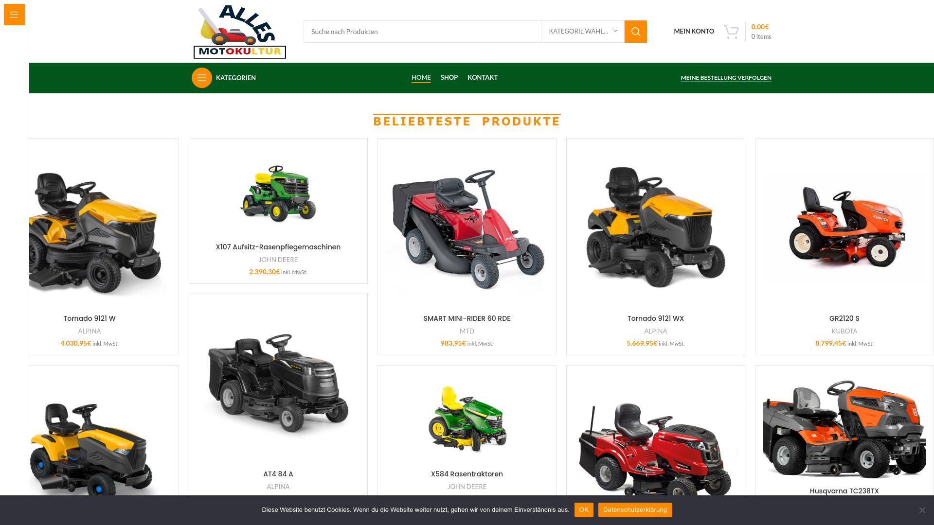 Die Webseite „allesmotokultur“ bietet eine Vielzahl von Produkten im Bereich der Gartentechnik an, insbesondere Rasenpflegegeräte wie Rasenmäher und Aufsitzrasenmäher. Das Sortiment umfasst eine Auswahl beliebter Modelle verschiedener Marken. Die gezeigten Produkte sind in einer klaren Übersicht angeordnet und beinhalten Bilder sowie technische Details. Zu den dargestellten Produkten gehört beispielsweise der „Tornado 9121 W“ von Alpina, der zu einem Preis von 4.030,95 Euro angeboten wird. Des Weiteren wird das Modell „X107 Aufsitz-Rasenpflegemaschinen“ von John Deere zu einem Preis von 2.390,30 Euro gelistet. Auch der „SMART MINI-RIDER 60 RDE“ von MTD ist im Angebot, dessen Preis bei 983,95 Euro liegt. Weitere Produkte umfassen den „Tornado 9121 WX“, ebenfalls von Alpina, mit einem Preis von 5.669,95 Euro und den „GR2120 S“ von Kubota, der einen Preis von 8.799,45 Euro aufweist. Die Webseite ermöglicht Nutzern, die Produkte durch eine Suchfunktion zu finden und bietet verschiedene Kategorien zur besseren Navigation. Es gibt einen Bereich für die beliebtesten Produkte, der eine Auswahl trifft und den Nutzern hilft, schnell auf gefragte Modelle zuzugreifen. Des Weiteren sind zusätzliche Informationen zu den einzelnen Artikeln bereitgestellt, wie Markennamen und detaillierte Preisinformationen. Die Webseite weist darauf hin, dass sie Cookies verwendet, um die Nutzererfahrung zu optimieren. Außerdem gibt es einen Hinweis auf eine Datenschutzerklärung, die Informationen über den Umgang mit Nutzerdaten enthält. Insgesamt stellt die Webseite eine Plattform dar, auf der Nutzer verschiedene Produkte für die Rasenpflege kaufen können, sowie Angebote von renommierten Marken in diesem Bereich präsentiert werden. Es werden direkte Links zu den einzelnen Produkten bereitgestellt, die eine weitere Erkundung und mögliche Käufe ermöglichen.