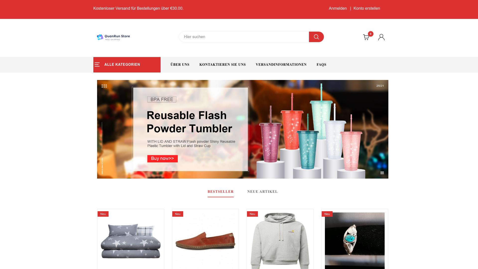 Die Webseite „QuanRun Store“ bietet eine Vielzahl von Produkten in unterschiedlichen Kategorien an. Auf der Startseite wird ein auffälliges Produkt beworben: der „Reusable Flash Powder Tumbler“, ein wiederverwendbarer Plastikbecher, der mit einem Deckel und Strohhalm geliefert wird. Dieser Becher hebt sich durch eine glänzende Oberfläche mit einem auffälligen Design hervor. Informationen über die BPA-Freiheit des Materials sind ebenfalls angegeben. Unter der Rubrik „Bestseller“ sind mehrere Artikel aufgelistet, die als beliebte Produkte hervorgehoben werden. Zu diesen gehören unter anderem verschiedene modische Artikel wie Kleidung, Schuhe und Heimtextilien. Beispielsweise wird ein graues Kissen-Sets mit Sternenmuster sowie ein paar braune Schuhe und ein graues Sweatshirt präsentiert. Diese Artikel sind mit einem “neu”-Label gekennzeichnet, was darauf hinweist, dass sie kürzlich zum Sortiment hinzugefügt wurden. Zusätzlich gibt es eine Sektion mit neuen Artikeln, die weitere Produkte zeigt, wobei diese dort ebenfalls als neu gekennzeichnet sind. Die Webseite enthält eine Suchfunktion, die es Nutzern erlaubt, gezielt nach Produkten zu suchen. Darüber hinaus finden sich Links zu Informationen über das Unternehmen, Kontaktmöglichkeiten, Versandinformationen sowie häufige Fragen (FAQs). In der oberen Leiste wird unter anderem die Option für kostenlosen Versand ab einem Bestellwert von 30 Euro angezeigt. Die Navigation auf der Webseite erfolgt über ein Menü, das die Auswahl aller Kategorien ermöglicht, um den Nutzern das Finden spezifischer Produkte zu erleichtern. Die Präsentation der Produkte ist visuell ansprechend gestaltet, und die Seite zielt darauf ab, ein breites Sortiment anzubieten, das sowohl praktische alltägliche Gegenstände als auch modische Artikel umfasst. Die Webseite scheint für eine breite Zielgruppe konzipiert zu sein und bietet eine einfache Möglichkeit, verschiedene Produkte online zu erwerben.