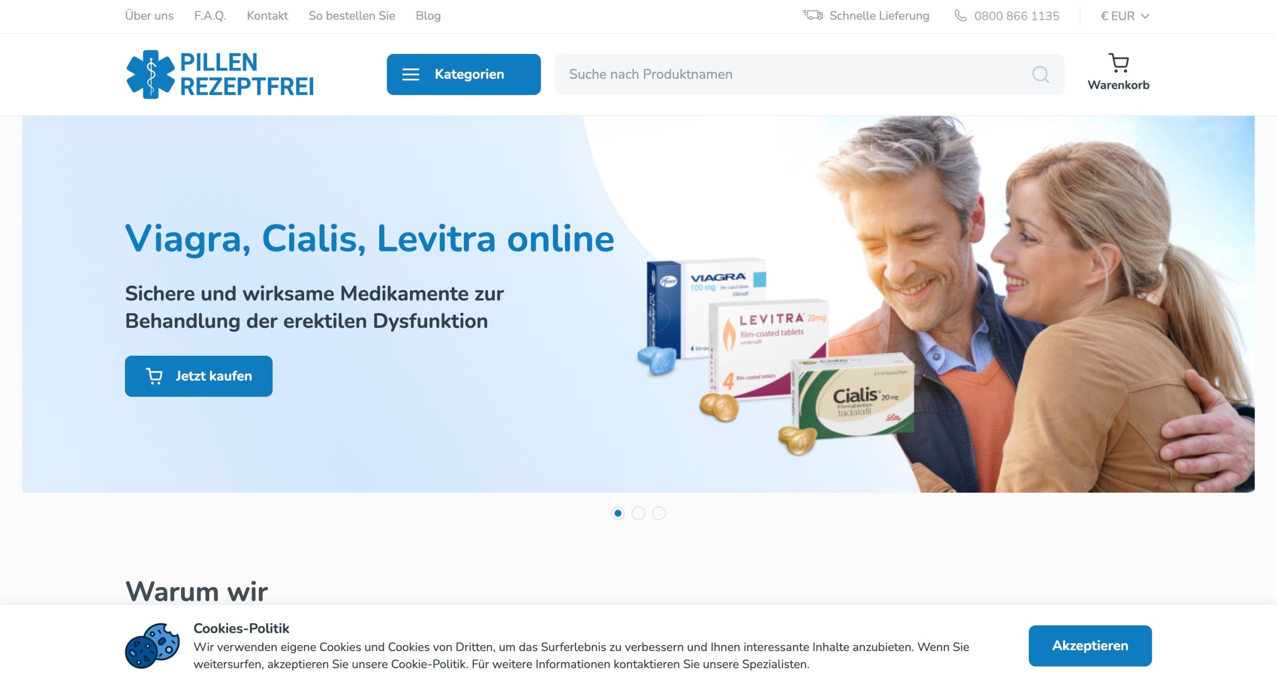 Die Webseite „Pillen Rezeptfrei“ bietet eine Auswahl an Medikamenten zur Behandlung der erektilen Dysfunktion, insbesondere Viagra, Cialis und Levitra. Die Seite vermittelt, dass diese Medikamente ohne Rezept erhältlich sind. Auf der Hauptseite werden die Produkte durch entsprechende Abbildungen vorgestellt, die den Nutzern als visuelle Hilfestellung dienen. Zusätzlich enthält die Webseite Informationen über die Produkte, vermutlich auch zu deren Wirkungsweise und Dosierung. Ein Button mit der Aufschrift „Jetzt kaufen“ lädt dazu ein, die Medikamente zu erwerben. Die Nutzer können wohl durch die Auswahl der Produkte navigieren und ihre Bestellung direkt über die Webseite durchführen. Die Seite bietet außerdem eine Sektion, die sich wohl mit weiteren Informationen zu den angebotenen Dienstleistungen befasst. Hier könnten Aspekte wie Zahlungsoptionen, Versandbedingungen und eventuell ein FAQ-Bereich angesprochen werden, der häufige Fragen von Nutzern beantwortet. Ein Hinweis zu einer möglichen Cookie-Nutzung deutet darauf hin, dass die Webseite Cookies verwendet, um das Nutzererlebnis zu optimieren und personalisierte Inhalte bereitzustellen. Nutzer werden möglicherweise auch auf eine Datenschutzrichtlinie hingewiesen, die weitere Informationen zur Datenerhebung und -verwendung bereitstellt. Insgesamt konzentriert sich die Webseite auf den direkten Verkauf von bestimmten Medikation zur Behandlung sexueller Funktionsstörungen und richtet sich an ein Publikum, das an diesen spezifischen Arzneimitteln interessiert ist. Die Darstellung ist klar und benutzerfreundlich, dennoch sollten potenzielle Käufer die Aspekte der Vertrauenswürdigkeit und Sicherheit im Blick behalten, bevor sie eine Kaufentscheidung treffen.