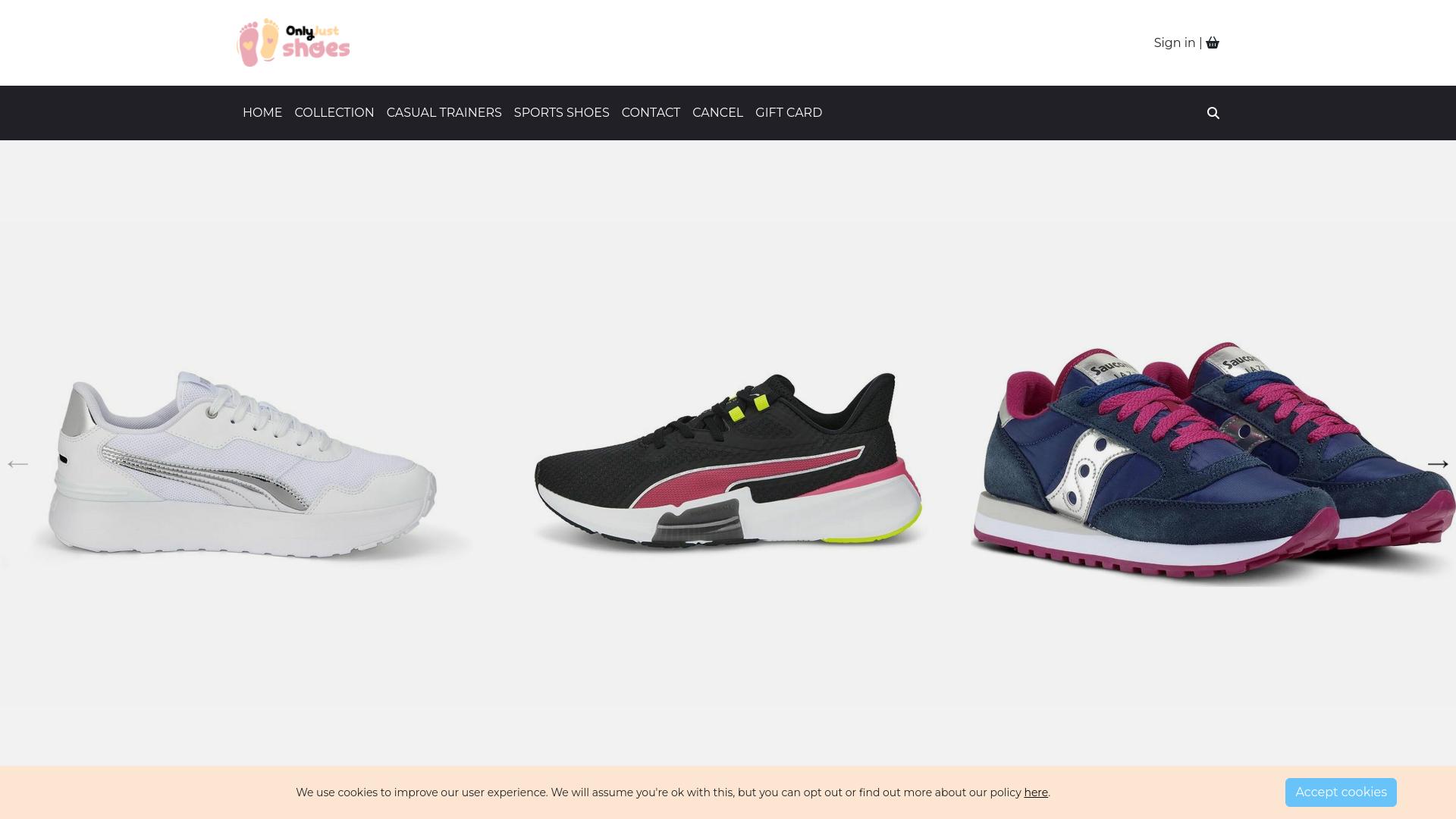 Die Webseite „Only Just Shoes“ bietet eine Auswahl an Schuhen, insbesondere Sneakers und Sportschuhe, an. Auf der Startseite werden drei verschiedene Modelle präsentiert. Diese Modelle zeichnen sich durch unterschiedliche Designs, Farben und Materialien aus. Das erste Modell links ist ein weißer Sneaker, der durch eine klare Linienführung und eine Kombination aus Stoff und Lederimitation hervorsticht. Es sind keine spezifischen Produktinformationen oder Preise direkt auf der Anzeige zu finden. In der Mitte der Darstellung befindet sich ein schwarzer Sportschuh mit rosa und limefarbenen Akzenten. Dieser Schuh wird womöglich für sportliche Aktivitäten empfohlen, da er eine robuste Bauweise und eine verstärkte Sohle aufweist. Auch hier sind keine detaillierten Angaben zu Größen, Materialien oder Preisinformationen zu finden. Das dritte Modell rechts ist ein klassischer Sneaker in dunkelblau mit pinken Schnürsenkeln und einer helleren Sohle. Dieses Modell könnte einen retro-inspirierten Look verkörpern, was oft bei Sneakers beliebt ist. Wiederum fehlen präzise Details, die Aufschluss über die Verfügbarkeit oder die speziellen Eigenschaften des Schuhs geben. Die Webseite weist zudem auf die Verwendung von Cookies hin, um die Benutzererfahrung zu verbessern. Es gibt eine allgemeine Datenschutzerklärung und Optionen, um Cookies zu akzeptieren oder abzulehnen. Zusätzlich sind einige Navigationspunkte am oberen Rand der Seite sichtbar, darunter „Kollektion“, „Casual Trainers“, „Sports Shoes“, „Kontakt“, „Stornieren“ und „Geschenkkarte“. Diese Links deuten darauf hin, dass Nutzer sowohl durch verschiedene Kategorien von Schuhen stöbern als auch Kontakt zu den Betreibern der Webseite aufnehmen können. Insgesamt bietet die Webseite eine visuelle Übersicht über einige Schuhmodelle, jedoch ohne tiefgehende Informationen zu den einzelnen Angeboten.