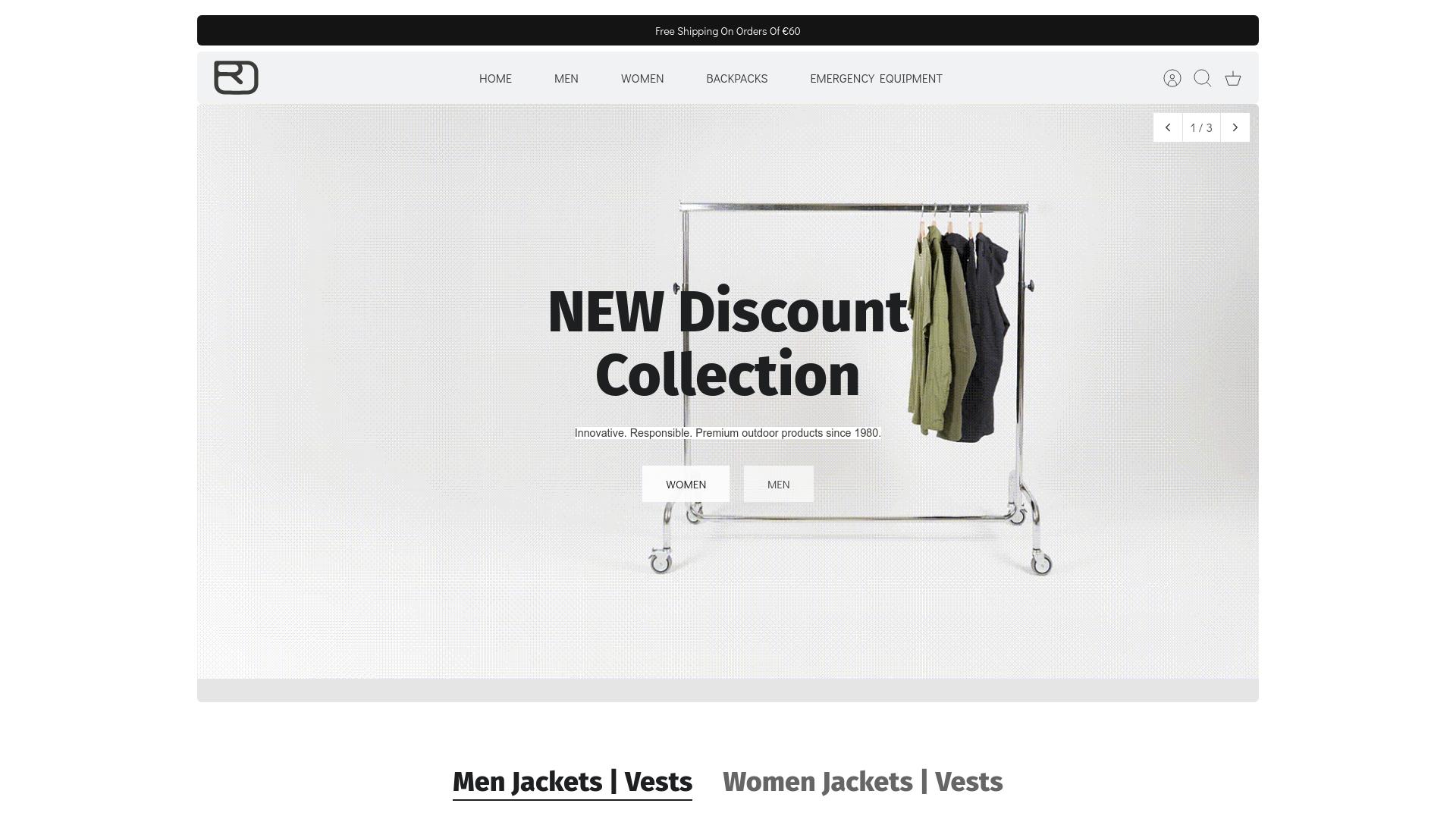 Die Webseite präsentiert eine Auswahl an Produkten im Bereich Outdoor-Bekleidung und Ausrüstung. Im Fokus stehen dabei insbesondere Jacken und Westen für Männer und Frauen. Unter der Kategorie „NEW Discount Collection“ wird eine neue Kollektion beworben, die anscheinend rabattierte Artikel umfasst. Die Webseite hebt eine Kombination aus Innovation und Verantwortung hervor und gibt an, dass sie seit 1980 hochwertige Outdoor-Produkte anbieten. Die Hauptnavigation der Seite bietet verschiedene Kategorien, darunter „Men“, „Women“, „Backpacks“ und „Emergency Equipment“. Jede dieser Kategorien scheint gezielt Produkte anzubieten, die auf die Bedürfnisse von Outdoor-Enthusiasten zugeschnitten sind. Insbesondere wird der Bereich für Jacken und Westen erwähnt, was darauf hindeutet, dass eine Vielzahl von Kleidungsstücken zur Auswahl steht. Zusätzlich gibt es Hinweise auf Angebote wie „Free Shipping On Orders Of €60“, was auf eine Versandkostenfreiheit bei bestimmten Bestellwerten hinweist. Informationen über die Materialien oder die spezifischen Funktionen der Produkte sind auf der Hauptseite nicht explizit aufgeführt, da der Schwerpunkt mehr auf der Präsentation der Produktkategorien liegt. Die Gestaltung der Webseite ist einfach und nutzerfreundlich. Auf den ersten Blick sind die Produkte ansprechend angeordnet, wobei der visuelle Fokus auf den Jacken hängt. Eventuell könnten die Nutzer eine detailliertere Ansicht oder Informationen zu den jeweiligen Produkten wünschen, da solche Angaben auf der Startseite nicht bereitgestellt werden. Darüber hinaus könnte die Webseite durch die Bereitstellung von Größen- und Pflegetipps oder Materialbeschreibungen für eine umfassendere Nutzererfahrung sorgen. Bislang bietet die Seite nur die Möglichkeit zur Kategorisierung der angebotenen Produkte. Insgesamt konzentriert sich die Webseite darauf, eine Plattform für den Einkauf von Outdoor-Kleidung und Ausrüstung bereitzustellen, während sie gleichzeitig auf Rabatte und spezielle Angebote hinweist.