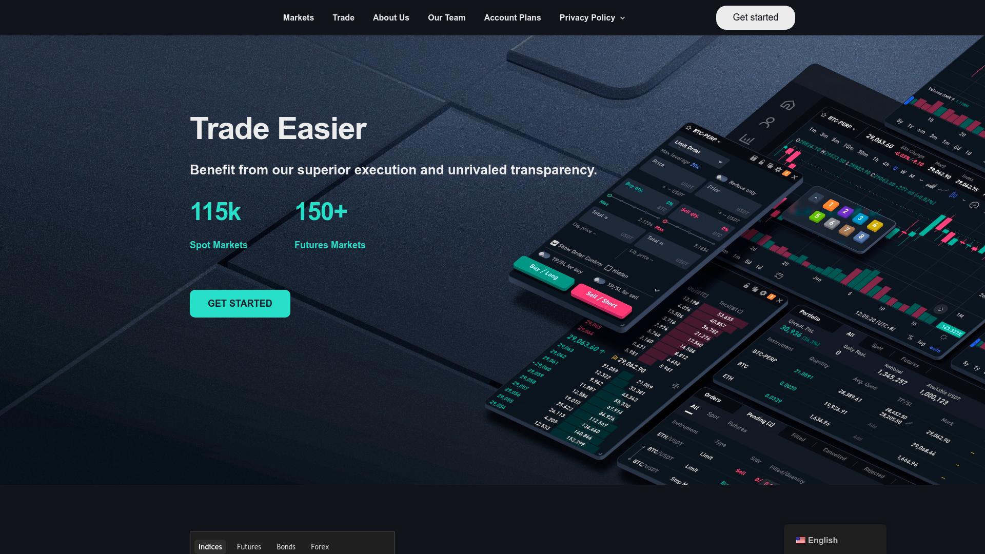 Die Webseite bietet eine Handelsplattform mit einem umfangreichen Angebot an finanziellen Handelsmöglichkeiten. Sie gibt an, über 115.000 Spot-Märkte und mehr als 150 Futures-Märkte anzubieten. Die Plattform scheint darauf ausgelegt zu sein, Nutzern eine einfache und effiziente Handelsumgebung zu bieten. Auf der Hauptseite wird mit der Aussage „Trade Easier“ geworben, wobei auf vorteilhafte Ausführungen und umfangreiche Transparenz hingewiesen wird. Es wird ein klarer Fokus auf den Handel von Kryptowährungen gelegt, und die Benutzeroberfläche scheint mehrere Funktionen für den aktiven Handel zu integrieren, darunter Optionen zum Kaufen und Verkaufen von digitalen Vermögenswerten sowie spezifische Funktionen für Limit- und Marktaufträge. Zusätzlich scheint die Plattform Handelsinstrumente und Analysetools bereit zu stellen, die es Nutzern ermöglichen, Marktbewegungen zu verfolgen und geeignete Handelsentscheidungen zu treffen. Grafische Darstellungen in Form von Charts sind vorhanden, die wahrscheinlich Preisbewegungen und Handelsvolumina visualisieren. Die Webseite hat auch einen Abschnitt über Kontopläne, die möglicherweise verschiedene Handelslevels oder Vorteile für Nutzer mit unterschiedlichen Bedürfnissen oder Handelsstrategien darstellen. Ein Menü am unteren Rand der Seite bietet Zugang zu weiteren Informationen über verschiedene Arten von Märkten, darunter Indizes, Futures, Anleihen und Forex. Zudem wird die Möglichkeit erwähnt, sich zu registrieren oder einen Account zu erstellen, um mit dem Handel zu beginnen. Informationen über die Datenschutzpolitik sind ebenfalls vorhanden, was darauf hindeutet, dass Nutzerdaten auch bei der Handelsaktivität beachtet werden. Insgesamt scheint die Webseite ein umfassendes Handelsangebot bereitzustellen, richtet sich an Nutzer, die aktiv in den Finanzmärkten agieren möchten, und bietet verschiedene Märkte und Funktionen, um den Handelsprozess zu unterstützen.