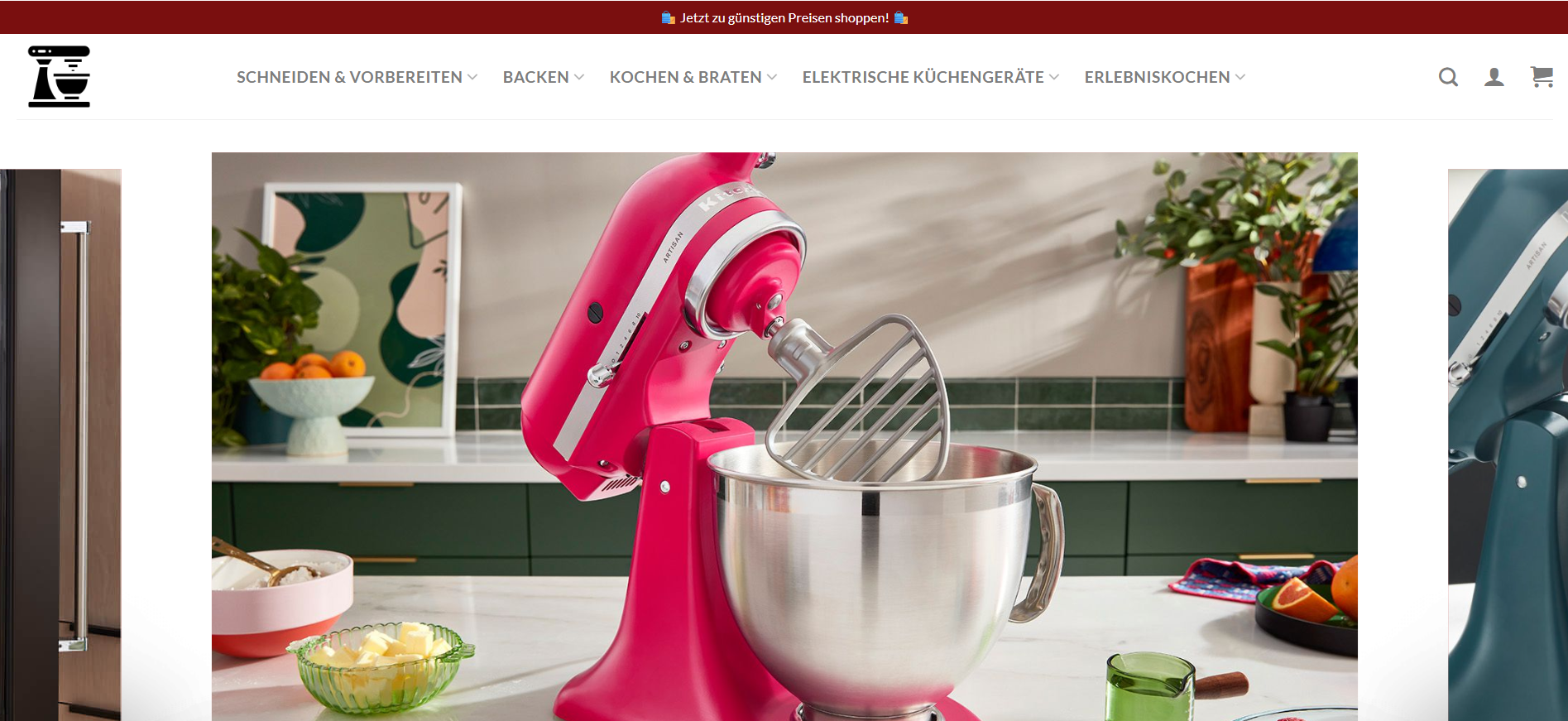 Die Webseite bietet eine Auswahl an Küchenprodukten und -geräten, die für verschiedene Zubereitungsarten in der Küche konzipiert sind. Im Fokus stehen insbesondere elektrische Küchengeräte, die für das Schneiden, Backen, Kochen und Braten verwendet werden können. Unter dem Menüpunkt „Schneiden & Vorbereiten“ könnten verschiedene Werkzeuge und Gadgets gelistet sein, die beim Vorbereiten von Zutaten, wie beispielsweise Messern oder Küchenmaschinen, unterstützen. Im Bereich „Backen“ sind möglicherweise Produkte wie Rührgeräte, Backformen und Zubehör zur Anfertigung von Backwaren zu finden. Des Weiteren wird auch ein Sortiment an elektrischen Küchengeräten angeboten, das unter anderem Geräte zur Zubereitung von Speisen umfasst. Hierbei könnten beispielsweise Mixgeräte, Standmixer oder andere Küchengeräte vorgestellt werden, die für die Zubereitung von Mahlzeiten sowie Desserts dienen. Ein Abschnitt namens „Erlebniskochen“ könnte Angebotspakete oder Information zu Kochkursen beinhalten, die Nutzern die Möglichkeit geben, ihre Kochfähigkeiten zu verbessern oder neue Rezepte auszuprobieren. Die Webseite enthält auch eine grafische Aufmachung, die eine ansprechende Präsentation der Produkte beinhalten könnte. Die Farbgestaltung und Anordnung der Produkte in den gezeigten Bildern scheint darauf abzuzielen, eine einladende und moderne Küchenerfahrung zu vermitteln. Schließlich ist es wahrscheinlich, dass die Webseite spezielle Angebote oder Rabatte bewirbt, um Nutzer zum Kauf zu animieren. Links zu Produktkategorien und eine Suchfunktion könnten ebenfalls verfügbar sein, um die Navigation durch das Angebot zu erleichtern. Insgesamt scheint die Webseite angelegt zu sein, um eine umfassende Auswahl an Küchenprodukten anzubieten, die Nutzern bei der Zubereitung von Speisen und beim Backen unterstützen sollen.
