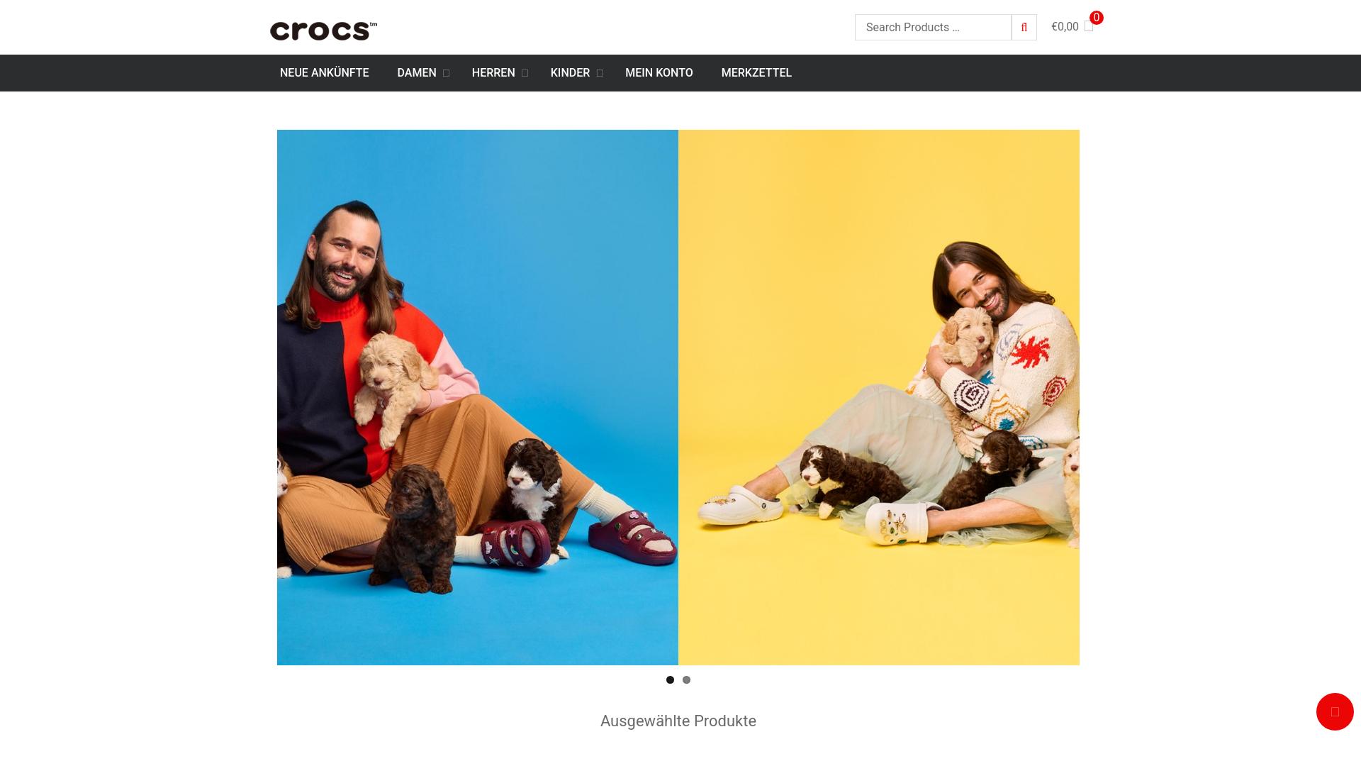 Die Webseite bietet eine Auswahl an Produkten der Marke Crocs an, die hauptsächlich für den Fußbekleidungsbereich bekannt ist. Auf der Seite sind verschiedene Modelle von Sandalen und geschlossenen Schuhen dargestellt. Diese Produkte sind in unterschiedlichen Farben und Designs erhältlich. Die Präsentation umfasst sowohl Damen- als auch Herrenmode sowie Kinderschuhe. Visuell wird die Webseite durch Bilder von Models unterstützt, die die Schuhe zusammen mit Hunden präsentieren. Die Darstellung der Produkte erfolgt in einem auffälligen Layout, das aus bunten Hintergründen besteht, was den Fokus auf die Schuhe lenkt. Der Benutzer kann durch verschiedene Kategorien navigieren, darunter „Neue Ankünfte“, „Damen“, „Herren“ und „Kinder“. Ein Suchfeld ist vorhanden, um gezielt nach bestimmten Produkten zu suchen. Der Warenkorb ist sichtbar, was darauf hinweist, dass Benutzer Produkte zum Kauf hinzufügen können. Zudem sind Bereiche für die Erstellung eines Benutzerkontos und das Speichern von Lieblingsprodukten vorhanden, die die Benutzerfreundlichkeit der Seite erhöhen. Die Webseite könnte auch Informationen zu den jeweiligen Produkten bereitstellen, wie zum Beispiel Materialangaben, Pflegehinweise und Größenoptionen, um den Nutzern bei der Kaufentscheidung zu helfen. Es gibt keine Hinweise auf besondere Angebote oder Rabatte auf der vorliegenden Seite. Die Gesamtdarstellung der Webseite ist darauf ausgerichtet, ein breites Publikum anzusprechen, das an modischen und funktionalen Schuhen interessiert ist. Durch die visuelle Präsentation und die einfache Navigation wird ein Zugang zu den Produkten geschaffen. Es wird jedoch keine spezifische Unternehmens- oder Kontaktinformation bereitgestellt, die über die Produkte hinausgeht.