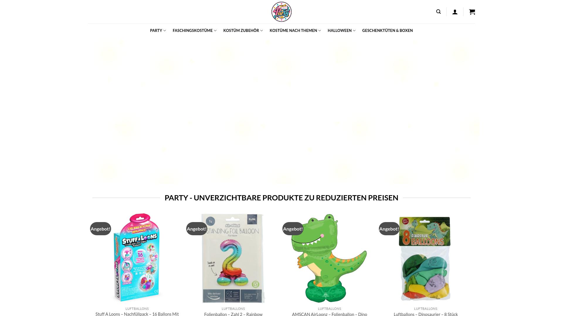 Die Webseite bietet eine Auswahl an Partyartikeln und Dekorationen an, die für verschiedene Feierlichkeiten geeignet sind. Zu den wichtigsten Kategorien gehören Faschingskostüme, Kostüme nach Themen wie Halloween, und diverses Kostümzubehör. Der Schwerpunkt der Angebote liegt auf luftgefüllten Produkten, darunter verschiedene Ballonarten. Beispielhafte Produkte, die auf der Seite angezeigt werden, umfassen das Set „Stuff A Loons“, das 16 Ballons beinhaltet, und Folienballons in Form von Zahlen und Tieren. Ein spezielles Augenmerk gilt bunten Steh-Ballon-Designs, die besonders für Kindergeburtstagsfeiern oder thematische Anlässe relevant sind. Zudem sind verschiedene Dinosaurier-beschriftete Ballons erhältlich, die einen spezifischen Fokus auf Tier-Themen orientieren. Des Weiteren wird eine Kategorie für Geschenkverpackungen und -boxen angeboten, die für die Präsentation von Geschenken oder zur Dekoration von Festen genutzt werden können. Die Preispolitik deutet auf reduzierte Preise hin, was darauf hindeutet, dass die Produkte möglicherweise im Vergleich zu anderen Anbietern günstig angeboten werden. Die Webseite ist in einer übersichtlichen Struktur gestaltet, die es Nutzern ermöglicht, schnell zwischen verschiedenen Kategorien zu navigieren und die gewünschten Artikel zu finden. Produkte werden mit kurzen Beschreibungen und Preisen präsentiert, wobei spezielle Angebote hervorgehoben werden. Ein Warenkorbsymbol ist ebenfalls vorhanden, was darauf hinweist, dass Benutzer Artikel zur späteren Bestellung auswählen können. Zusammenfassend lässt sich sagen, dass die Webseite ein breites Spektrum an Partybedarf und Dekorationsartikeln umfasst, mit einem besonderen Fokus auf Ballons und Kostüme für Feierlichkeiten. Die genaue Produktauswahl sowie die Preisgestaltung sind darauf ausgelegt, ein vielfältiges Angebot für Kunden zu schaffen, die an Feierlichkeiten oder besonderen Anlässen interessiert sind.
