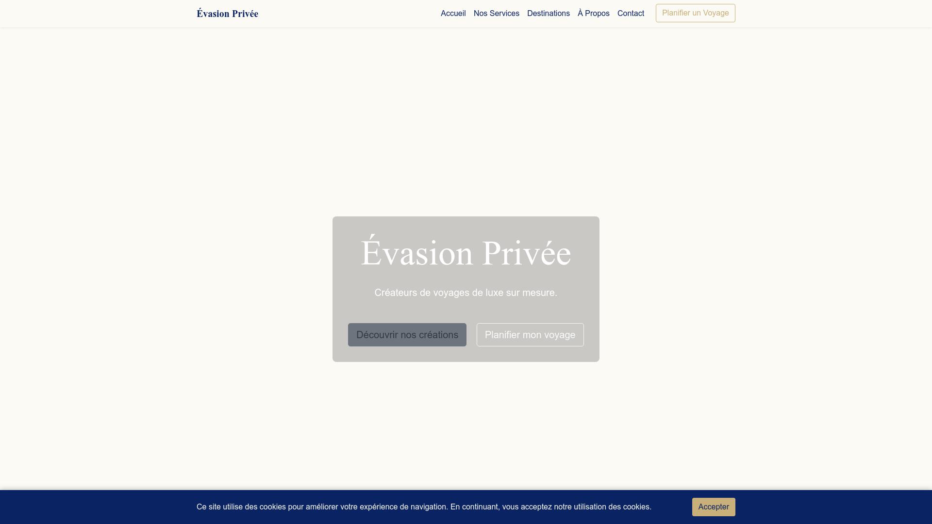 Die Webseite „Évasion Privée“ präsentiert sich als Anbieter von maßgeschneiderten Luxusreisen. Sie richtet sich an Kunden, die individuelle Reiseerlebnisse suchen. Auf der Homepage wird darauf hingewiesen, dass Kunden Reisen nach ihren spezifischen Wünschen und Bedürfnissen gestalten können. Die Seite bietet zwei Hauptaktionen: „Entdecken Sie unsere Kreationen“ und „Planen Sie meine Reise“. Diese Optionen scheinen darauf abzuzielen, den Nutzern entweder bereits gestaltete Reiseangebote vorzustellen oder die Planung einer individuellen Reise zu ermöglichen. Es ist anzumerken, dass die spezifischen Details zu den angebotenen Reisen, Zielen oder Preisen auf der getesteten Seite nicht direkt einsehbar sind. Zusätzlich wird beim Besuch der Seite ein Hinweis auf die Verwendung von Cookies angezeigt, der für die Verbesserung der Nutzererfahrung wirbt. Dies deutet darauf hin, dass die Webseite auf eine interaktive Nutzererfahrung abzielt, indem Informationen über die Website-Nutzung gesammelt werden. Weitere Navigationspunkte in der oberen Menüliste umfassen „Unsere Services“, „Destinationen“, „Über uns“ und „Kontakt“. Diese Bereiche könnten zusätzliche Informationen über die Dienstleistungen, mögliche Reiseziele und das Unternehmen selbst bereitstellen. Es bleibt jedoch unklar, welche spezifischen Ziele oder Dienstleistungen näher beschrieben werden, da der Zugriff auf diese Informationen im gegebenen Screenshot nicht ersichtlich ist. Insgesamt präsentiert sich die Webseite als Plattform, die auf individuelle Luxusreisen spezialisiert ist, ohne spezifische Details zu den angebotenen Reiseangeboten publik zu machen.