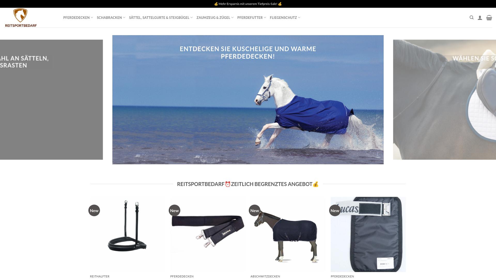 Die Webseite „Reitsportbedarf“ bietet eine Auswahl an Reitsportartikeln, insbesondere für Pferdebesitzer. Im Fokus stehen verschiedene Arten von Pferdecken, die als warmer Schutz für die Tiere beworben werden. Ein Bild auf der Webseite zeigt ein Pferd, das eine der angebotenen Decken trägt, und es wird auf die kuscheligen Eigenschaften dieser Produkte hingewiesen. Zusätzlich zur Kategorie der Pferdecken umfasst das Angebot weitere Produkte für den Reitsport. Darunter fallen Sättel, Sattelgurte, Schabracken sowie Zubehör wie Zaumzeug und Zügel. Diese Artikel sollen dazu dienen, die Ausrüstung und Pflege von Pferden zu unterstützen. Der Bereich der Pferdefutterprodukte wird ebenfalls erwähnt, was darauf hindeutet, dass Kunden hier auch Nahrungsmittel für ihre Pferde finden können. Die Gestaltung der Webseite ist darauf ausgelegt, den Nutzern die Produktkategorien übersichtlich zu präsentieren. Es scheint temporäre Angebote unter dem Begriff „zeitlich begrenztes Angebot“ zu geben, die möglicherweise Preisnachlässe oder besondere Aktionen umfassen. Die Nutzer können durch eine klar strukturierte Navigation zwischen den verschiedenen Kategorien der Produkte wechseln und spezifische Artikel auswählen. Die Webseite bietet eine visuelle Darstellung der Produkte, oftmals mit Bildern, die sowohl die Nutzung der Artikel als auch deren Spezifikationen verdeutlichen. Ein weiteres Hinweisfeld ermutigt die Nutzer, Produkte auszuwählen und zu kaufen, wobei möglicherweise verschiedene Größen und Ausführungen verfügbar sind. Die Darstellung auf der Webseite richtet sich an Reitsportinteressierte und bietet eine zentrale Anlaufstelle für relevante Produkte im Bereich der Pferdepflege und -ausstattung. Dabei wird versucht, den Kunden ein umfassendes Angebot an Equipment für den täglichen Gebrauch im Umgang mit Pferden bereitzustellen.