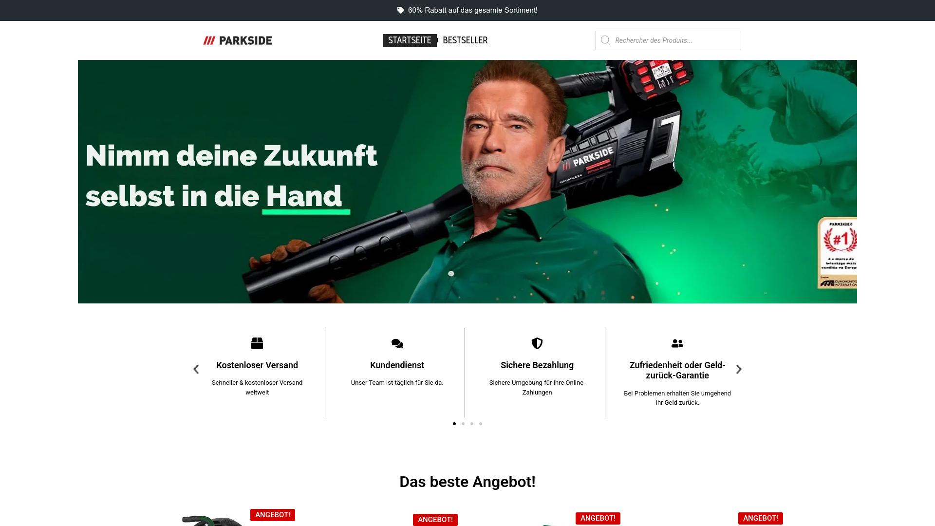 Die Webseite präsentiert verschiedene Produkte und Dienstleistungen von PARKSIDE, einer Marke, die in der Werkzeug- und Gartenbranche tätig ist. Auf der Startseite wird ein breites Sortiment an Werkzeugen und Zubehör angezeigt, das für Heimwerker und Gartennutzer relevant ist. Zu den beworbenen Produkten gehören unter anderem elektrische Werkzeuge, Gartengeräte und verschiedene Arten von Werkzeugzubehör. Ein großes Banner auf der Webseite hebt eine Rabattaktion von 60 % auf das gesamte Sortiment hervor. Dieses Angebot wird durch die Aussage unterstützt, dass Kunden ihre Zukunft selbst in die Hand nehmen können, was auf eine Vermarktung der Produkte im Sinne von Autonomie und Selbstständigkeit abzielt. Darüber hinaus sind Bilder von Werkzeugen und Anwendungsszenen zu sehen, um die Nutzungsmöglichkeiten der Produkte zu verdeutlichen. Die Webseite enthält mehrere Funktionen, die auf eine positive Benutzererfahrung abzielen. Dazu gehört die Option des kostenlosen Versands, der in dem Text hervorhebt, dass eine schnelle und kostenfreie Lieferung weltweit angeboten wird. Des Weiteren wird ein Kundenservice erwähnt, der über verschiedene Kommunikationswege erreichbar ist und den Kunden Unterstützung bietet. Die Sicherheit bei Online-Zahlungen wird ebenfalls angesprochen, was darauf hindeutet, dass die Webseite Maßnahmen zum Schutz der Zahlungsdaten der Nutzer implementiert hat. Zusätzlich wird eine Zufriedenheitsgarantie angeboten, die besagt, dass Kunden im Fall von Problemen ihr Geld zurückerhalten können. Diese Informationen sind darauf ausgerichtet, eine transparente Kaufabwicklung zu fördern und etwaige Bedenken der Nutzer zu adressieren. Insgesamt bietet die Seite eine Hilfestellung für Nutzer, die an Werkzeugen und Gartenprodukten interessiert sind, mit verschiedenen Möglichkeiten zum Stöbern und Kaufen. Die Produkte werden durch ansprechende Grafiken und Texte beworben, die den Nutzer ansprechen sollen.