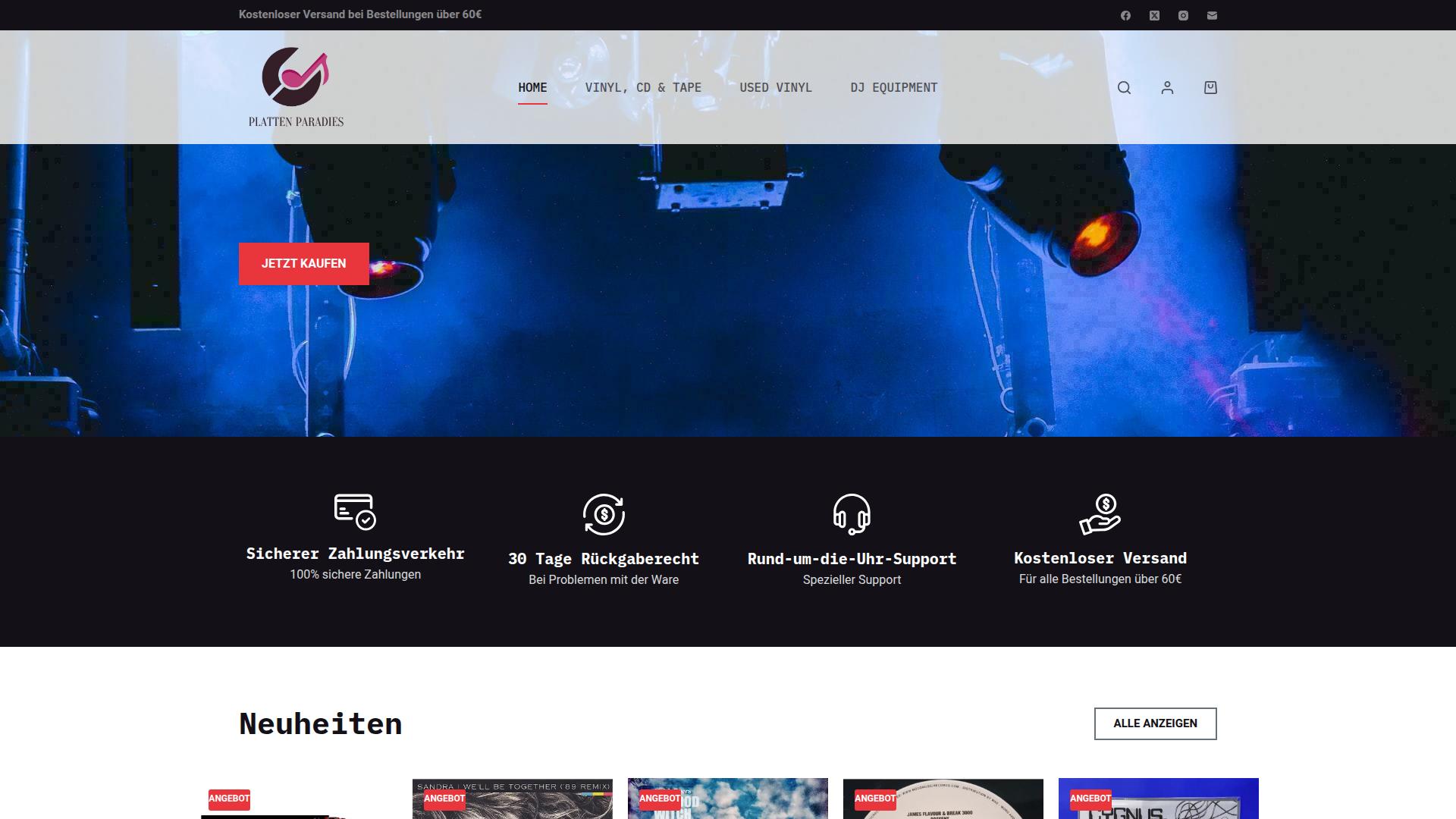 Die Webseite „Platten Paradies“ bietet eine Auswahl an Musikformaten sowie DJ-Ausrüstung an. Im oberen Bereich der Seite sind verschiedene Kategorien aufgeführt, die den Nutzern die Navigation erleichtern. Die Hauptkategorien umfassen „Vinyl, CD & Tape“, „Used Vinyl“ und „DJ Equipment“. Die Seite legt besonderen Wert auf den Verkauf von Vinylplatten, CDs und Kassetten. In der Kategorie „Used Vinyl“ werden gebrauchte Schallplatten angeboten, was auf ein breiteres Sortiment hinweist, das sowohl Neu- als auch Second-Hand-Produkte umfasst. Diese Auswahl könnte für Musikliebhaber von Interesse sein, die auf der Suche nach speziellen oder älteren Aufnahmen sind. Des Weiteren wird angegeben, dass die Webseite einen sicheren Zahlungsverkehr gewährleistet. Dies bedeutet, dass verschiedene Zahlungsmethoden zur Verfügung stehen, um die Sicherheit der Transaktionen zu unterstützen. Außerdem hebt die Seite ein 30-tägiges Rückgaberecht hervor, welches den Nutzern die Möglichkeit gibt, die Waren zurückzugeben, falls es Probleme geben sollte. Ein zusätzlicher Hinweis auf „Rund-um-die-Uhr-Support“ deutet darauf hin, dass Kundenbetreuung in verschiedenen Formaten bereitgestellt wird. Die Angebotsdarstellung wird durch die Sektion „Neuheiten“ ergänzt, die aktuelle Produkte anzeigen könnte. Hier finden sich typischerweise die neuesten Artikel oder Sonderangebote. Auf der Seite wird auch eine Versandoption erwähnt: Kostenloser Versand bei Bestellungen über 60 Euro ist ein weiterer Punkt, den die Webseite hervorhebt, was für potenzielle Käufer von Bedeutung sein könnte, die größere Einkäufe tätigen wollen. Insgesamt vermittelt die Webseite Informationen über eine Vielzahl von Musikformaten und angrenzenden Dienstleistungen, ohne spezifische Empfehlungen oder Bewertungen abzugeben. Sie richtet sich damit an ein Publikum, das Interesse an Schallplatten, CDs und DJ-technischem Equipment hat.