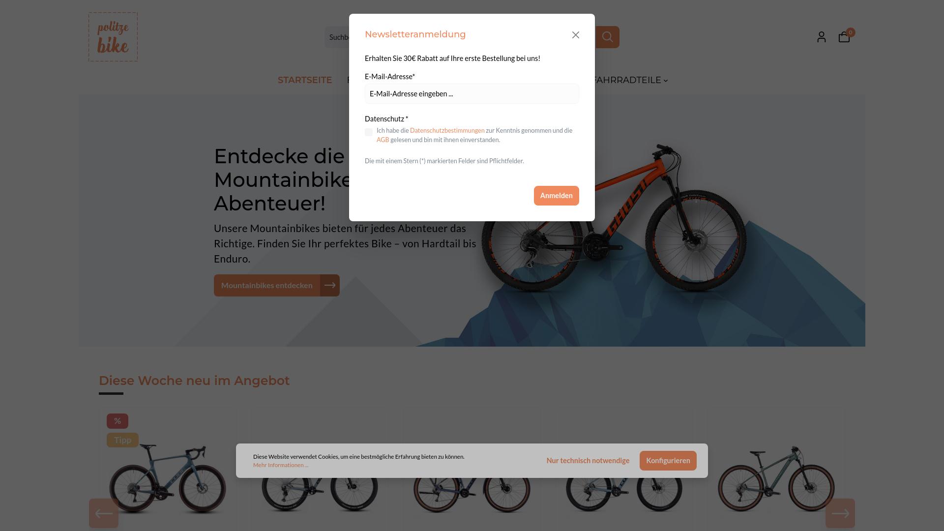 Die Webseite „polizei-bike“ präsentiert sich als Anbieter von Mountainbikes und verwandten Produkten. Auf der Startseite wird der Nutzer angesprochen und dazu aufgefordert, die Vielfalt an Mountainbikes zu entdecken, die für unterschiedliche Abenteuer geeignet sein sollen. Es wird darauf hingewiesen, dass die Auswahl vom Hardtail bis zum Enduro-Modell reicht. Ein zentraler Bestandteil der Webseite ist ein Hinweis auf einen Rabatt von 30 Euro auf die erste Bestellung, der an die Anmeldung zu einem Newsletter gekoppelt ist. Der Nutzer wird aufgefordert, seine E-Mail-Adresse einzutragen und sich mit den Datenschutzbestimmungen sowie den Allgemeinen Geschäftsbedingungen (AGB) vertraut zu machen. Im unteren Bereich der Webseite wird eine Auswahl an Produkten angezeigt, unterteilt nach Neuheiten und Angeboten, was darauf hindeutet, dass die Webseite aktiv sowohl neue als auch rabattierte Produkte präsentiert. Es besteht die Möglichkeit, verschiedene Mountainbikes direkt zu entdecken oder zu konfigurieren. Dies legt den Schwerpunkt auf Interaktivität und individuelle Anpassung des Kauferlebnisses. Darüber hinaus erwähnt die Seite, dass sie Cookies verwendet, um die Nutzererfahrung zu verbessern, und bietet einen Button für weitere Informationen darüber an. Der Nutzer hat die Möglichkeit, die Cookie-Einstellungen anzupassen oder auf nur technisch notwendige Cookies zu beschränken. Insgesamt fokussiert sich die Webseite darauf, ein breites Sortiment an Mountainbikes anzubieten und potenzielle Kunden zur Interaktion zu animieren, indem sie ansprechende Rabatte und einfache Möglichkeiten zur Produktauswahl bereitstellt. Die Gestaltung der Seite ist modern und benutzerfreundlich, was den Zugang zu den Produkten und Informationen erleichtert.