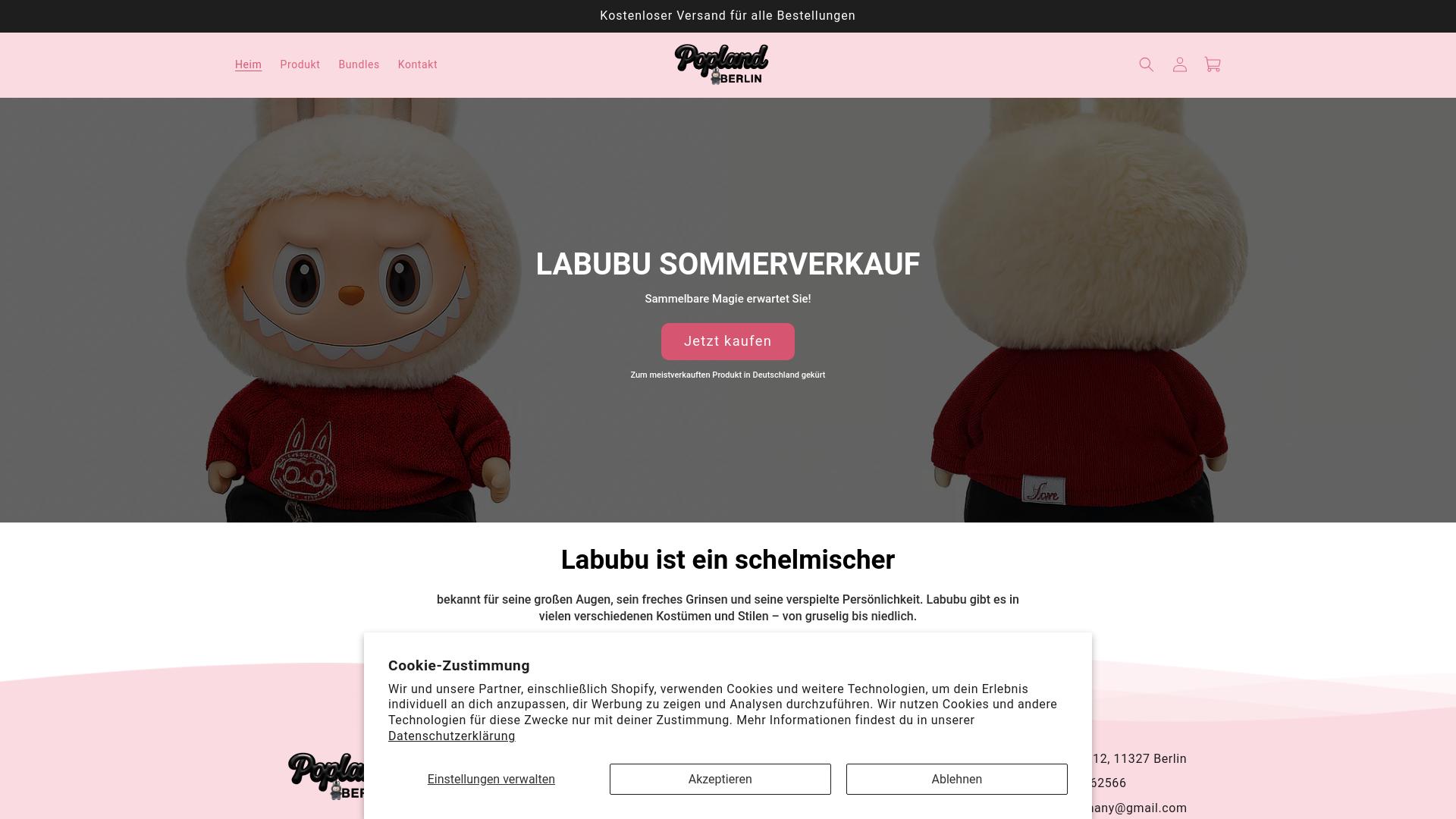 Die Webseite „Popland Berlin“ bietet eine Auswahl an figurativen Produkten, insbesondere Spielzeugfiguren aus der Reihe „Labubu“. Auf der Startseite wird ein Sommerverkauf beworben, der darauf hinweist, dass verschiedene Artikel reduziert sind und Nutzer zu Käufen animiert werden. Die Darstellung der Figuren zeigt eine Kombination aus niedlichen und gruseligen Elementen. In den Produktbeschreibungen werden die Charaktere als „schelmisch“ beschrieben, mit einem besonderen Fokus auf ihre großen Augen und das unverwechselbare Grinsen. Die Angebote scheinen auf eine Zielgruppe abzuzielen, die Interesse an Sammlerstücken und einzigartigen Designs hat. Es werden verschiedene Stile und Kostüme erwähnt, die die Figuren tragen, wobei eine gewisse Vielfalt im Design hervorgehoben wird. Zusätzlich bietet die Seite Informationen zu Bundles, was darauf hindeutet, dass Kombinationskäufe von mehreren Produkten möglich sind. Die Navigation der Seite umfasst mehrere Kategorien wie „Heim“, „Produkt“, „Bundles“ und „Kontakt“, was es Nutzern erleichtert, sich einen Überblick über das gesamte Sortiment zu verschaffen und gezielt die gewünschten Artikel zu finden. Des Weiteren wird ein Hinweis zur Verwendung von Cookies angezeigt, der die Benutzer zur Zustimmung auffordert, um das Nutzererlebnis zu personalisieren. Eine Datenschutzerklärung ist ebenfalls verlinkt, in der nähere Informationen zur Datenverarbeitung gegeben werden. Der Kontaktbereich der Webseite enthält eine Adresse in Berlin sowie eine E-Mail-Adresse für Anfragen. Es wird auch darauf hingewiesen, dass kostenloser Versand für alle Bestellungen angeboten wird. Insgesamt scheint die Webseite eine Plattform zu sein, die sich auf den Verkauf spezieller Spielzeugfiguren mit einem kreativen und humorvollen Design konzentriert, während sie potenzielle Kunden mit Verkaufsaktionen und einer benutzerfreundlichen Navigation ansprechen möchte.