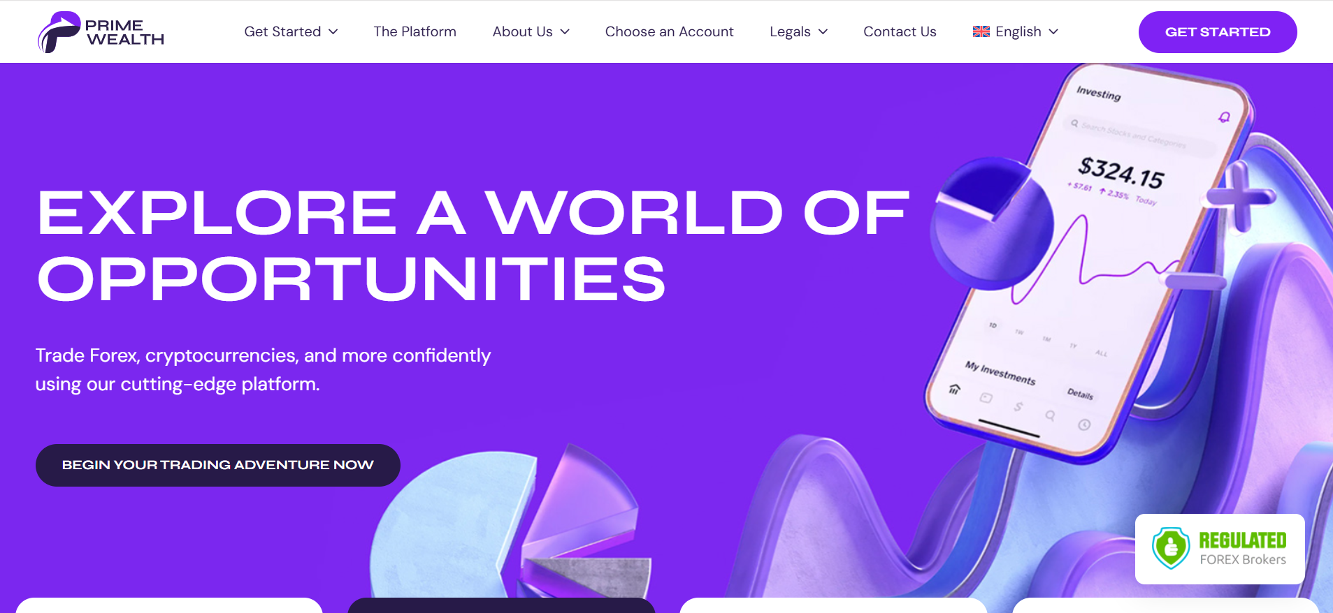 Die Webseite „Prime Wealth“ bietet eine Plattform für den Handel mit verschiedenen Finanzinstrumenten an, darunter Forex und Kryptowährungen. Die Hauptbotschaft der Seite ermutigt Nutzer, in eine „Welt der Möglichkeiten“ einzutauchen und verweist auf die Nutzung einer sogenannten „fortschrittlichen Plattform“, die möglicherweise auf Benutzerfreundlichkeit und technische Funktionalität ausgelegt ist. Auf der Website werden verschiedene Handelsmöglichkeiten und -instrumente präsentiert. Insbesondere wird auf den Handel von Devisen und digitalen Währungen hingewiesen. Die Plattform scheint darauf ausgerichtet zu sein, Nutzern ein Detailüberblick ihrer Investitionen zu bieten, was durch ein Beispiel auf einem Mobilgerät angedeutet wird. Diese Darstellung umfasst möglicherweise die Anzeige von Kontoständen, Kursänderungen und weiteren relevanten Daten für Anleger. Ein weiterer Bestandteil der Webseite ist die Einleitung zur Kontoeröffnung, die Nutzer dazu auffordert, mit dem Handel zu beginnen. Dies geschieht durch einen auffälligen Button mit der Beschriftung „Get Started“ (Loslegen). In der oberen Navigationsleiste sind verschiedene Optionen verfügbar, darunter Informationen über die Plattform selbst, die Auswahl von Kontotypen und rechtliche Hinweise. Zusätzlich wird auf die Regulierung von Forex-Brokern hingewiesen, was in einem grafischen Element auf der Seite visualisiert wird. Es wird nicht spezifiziert, welche Regulierungsbehörde zuständig ist oder welche Regelungen konkret eingehalten werden. Diese Informationspunkte sind für potenzielle Kunden möglicherweise von Interesse, da Regulierung in vielen Märkten ein Aspekt für die Sicherstellung von Fairness und Transparenz im Handel ist. Die gesamte Gestaltung der Webseite umfasst grafische Designelemente, die modern und ansprechend wirken können. Die Farbwahl in lila und grau sowie zusätzliche visuelle Komponenten könnten darauf abzielen, eine bestimmte Markenidentität zu etablieren. Die Webseite bietet insgesamt eine klare und strukturierte Benutzeroberfläche sowie einen leicht zugänglichen Einstieg in die Handelsaktivitäten. Insgesamt bietet die Webseite einen Überblick über die Handelsangebote und Funktionen, die potenziellen Nutzern zur Verfügung stehen, ohne jedoch detaillierte Informationen über die konkreten Bedingungen oder Risikohinweise bereitzustellen. Die Möglichkeit zur Kontoeröffnung wird hervorgehoben, was darauf hindeutet, dass die Plattform aktiv neue Nutzer gewinnen möchte.