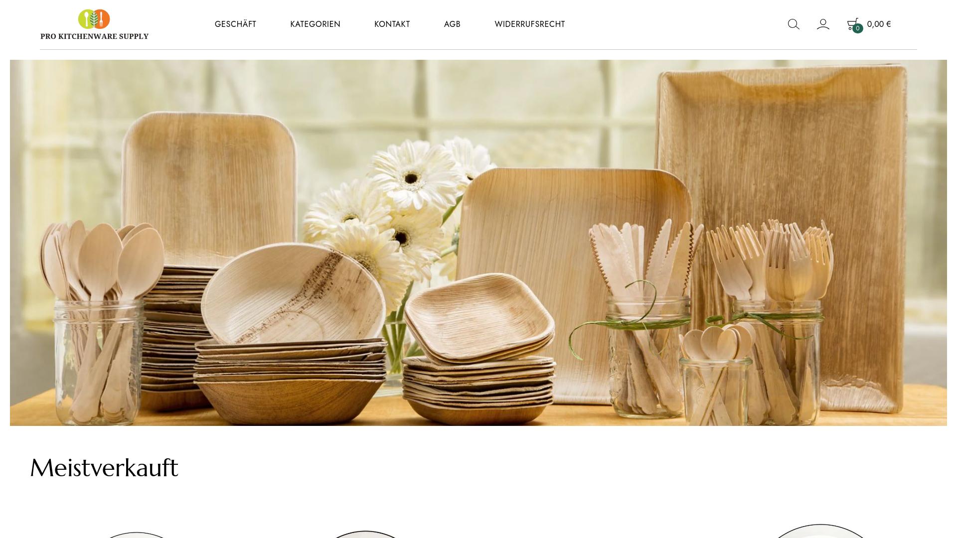 Die Webseite „Pro Kitchenware Supply“ bietet eine Auswahl an Küchenutensilien und -zubehör, die sich vor allem auf Geschirr und Besteck aus nachhaltigen Materialien konzentriert. Auf der Startseite wird eine Vielzahl von Produkten präsentiert, die hauptsächlich aus Holz und kompostierbaren Materialien bestehen. Zu den abgebildeten Artikeln zählen verschiedene Arten von Tellern, Schalen und Besteck, die für den einmaligen Gebrauch vorgesehen sind. Es wird deutlich, dass die angebotenen Produkte in einem umweltfreundlichen Kontext stehen, wobei der Fokus auf der Verwendung von Materialien liegt, die biologisch abbaubar sind. Die Produkte scheinen für verschiedene Anlässe wie Partys, Grillabende oder andere Veranstaltungen geeignet zu sein, bei denen ein praktisches und gleichzeitig umweltbewusstes Geschirr gefragt ist. Die Webseite trägt die Rubrik „Meistverkauft“, die darauf hinweist, dass bestimmte Produkte möglicherweise besonders beliebt sind, obwohl keine detaillierten Informationen zu den einzelnen Artikeln oder deren Beschreibungen bereitgestellt werden. Es wird nicht näher erläutert, welche spezifischen Produkte sich in dieser Kategorie befinden oder was diese von anderen Angeboten unterscheidet. Zusätzlich sind auf der Webseite Links zu verschiedenen Kategorien und einer Kontaktseite vorhanden. Nutzer haben die Möglichkeit, weitere Informationen über AGB (Allgemeine Geschäftsbedingungen) und das Widerrufsrecht einzusehen, was für Online-Shopper von Bedeutung sein kann. Die Website scheint darauf abzuzielen, ein einfaches und benutzerfreundliches Einkaufserlebnis zu bieten, wobei die Hauptnavigation klar strukturiert ist. Insgesamt bietet die Webseite „Pro Kitchenware Supply“ eine Auswahl an Küchenprodukten, die sich auf umweltfreundliche Alternativen konzentriert. Die dargestellten Artikel richten sich an Kunden, die Wert auf nachhaltige Lösungen in der Küche legen, ohne dass eine detaillierte Produktbeschreibung oder Information über die Herstellungsprozesse gegeben wird.