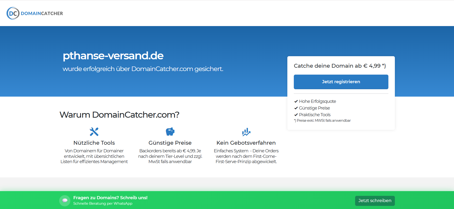Die Webseite DomainCatcher.com bietet Dienstleistungen zur Registrierung von Internet-Domains an. Auf der Homepage wird darauf hingewiesen, dass Nutzer über die Plattform erfolgreich Domains sichern können, mit dem Beispiel einer spezifischen Domain, die erfolgreich registriert wurde. Das Angebot beinhaltet verschiedene Funktionen, die für Nutzer von Domains nützlich sind. Dazu zählen unter anderem Tools, die speziell für Domaininhaber entwickelt wurden. Diese Tools sind so gestaltet, dass sie eine effiziente Verwaltung von Domains ermöglichen und Nutzer bei ihrem Management unterstützen. Die Seite hebt darüber hinaus die Möglichkeit hervor, Domains bereits ab einem Preis von 4,99 Euro zu registrieren. Es wird darauf hingewiesen, dass die Preisgestaltung je nach Nutzerlevel variieren kann und zusätzliche Mehrwertsteuer anfallen könnte. Die Plattform verfolgt einen transparenten Preisansatz und betont, dass es kein aufwendiges Gebotsverfahren gibt. Stattdessen wird beschrieben, dass Bestellungen nach dem First-Come-First-Serve-Prinzip bearbeitet werden. Zusätzlich fordert die Seite die Nutzer auf, sich bei Fragen zu Domains per WhatsApp zu melden, was eine Form der direkten Kundenkommunikation darstellt. Auf diese Weise sollen mögliche Unsicherheiten oder spezifische Anfragen schnell geklärt werden. Die ausgewählten Inhalte der Website sind darauf ausgerichtet, potenzielle Kunden über die angebotenen Dienstleistungen zu informieren und sie zur Nutzung der Plattform zu ermutigen. Zusammengefasst stellt DomainCatcher.com eine Plattform zur Verfügung, die sich auf die Registrierung und Verwaltung von Domains spezialisiert hat, und bietet dabei eine Reihe von Funktionen und Preisoptionen an.