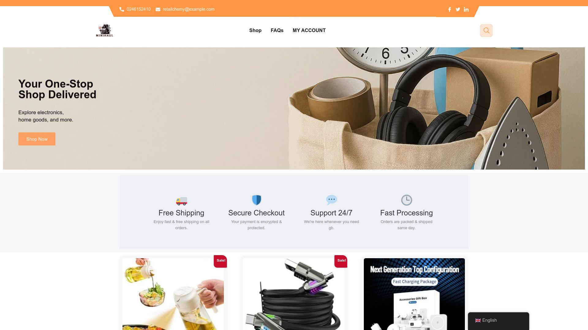 Die Webseite bietet eine Auswahl an Produkten in den Kategorien Elektronik und Haushaltswaren an. Sie bewirbt sich als eine „One-Stop Shop“, was darauf hindeutet, dass Nutzer verschiedene Artikel an einem Ort finden können. Das Angebot umfasst sowohl Elektronikartikel als auch Haushaltsgegenstände, was eine breite Palette von potenziellen Käufen abdeckt. Besondere Merkmale der Webseite sind eine kostenlose Versandoption für alle Bestellungen, eine sichere Zahlungsabwicklung sowie eine Unterstützung rund um die Uhr. Diese Funktionen werden hervorgehoben, um den Nutzern ein einfaches und sicheres Einkaufserlebnis zu bieten. Die Webseite zeigt eine klare Struktur mit einem Layout, das es den Nutzern ermöglicht, die verschiedenen Produktkategorien zu durchsuchen. In der unteren Sektion der Seite sind verschiedene Produktangebote dargestellt, darunter Küchenzubehör und alternative Technikartikel. In dem Bereich, der als „Nächste Generation Top-Konfiguration“ bezeichnet wird, werden spezifische Produkte hervorgehoben, die anscheinend besonders zum Kauf empfohlen werden. Diese Artikel scheinen moderne Technologien oder innovative Anwendungen anzusprechen, jedoch werden keine spezifischen Produkte detailliert beschrieben. Zusätzlich enthält die Seite ein FAQ-Bereich, der den Nutzern helfen kann, häufige Fragen zu klären und Informationen zu Versand, Rückgaben und anderen möglichen Anliegen bereitzustellen. Abgesehen von den genannten Merkmalen gibt es keine weiteren spezifischen Informationen über die Art der angebotenen Dienstleistungen oder der verfügbaren Produkte. Die Webseite enthält Kontaktinformationen, die es den Nutzern ermöglichen, sich bei Anliegen direkt an den Betreiber zu wenden. Insgesamt scheint die Webseite darauf abzuzielen, eine Vielzahl von Produkten einfach zugänglich zu machen und dabei Unterstützung sowie besondere Kaufbedingungen anzubieten.