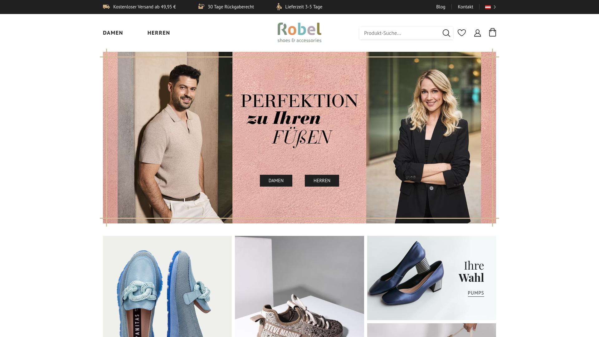 Die Webseite Robel bietet eine Auswahl an Schuhen und Accessoires für Damen und Herren an. Auf der Hauptseite sind zwei Kategorien hervorgehoben: „Damen“ und „Herren“, die es den Nutzern ermöglichen, gezielt nach Produkten für eine der beiden Zielgruppen zu suchen. Ein zentral platzierter Slogan weist auf die angestrebte Perfektion im Angebot hin, was die allgemeine Ausrichtung der Seite verdeutlicht. Im unteren Bereich der Startseite sind verschiedene Produktkategorien abgebildet. Dazu zählen unter anderem eine Auswahl an Schuhen, die durch visuelle Elemente präsentiert werden. Es sind unterschiedliche Stile und Designs sichtbar, die typischerweise in modischen Farbgebungen gehalten sind. Zu den abgebildeten Schuhtypen gehören unter anderem sportliche Modelle sowie elegante Varianten, die möglicherweise für verschiedene Anlässe geeignet sind. Die Produkte scheinen sowohl Freizeit- als auch formelle Stilrichtungen abzudecken. Des Weiteren wird auf der Seite auf einen kostenlosen Versand hingewiesen, der ab einem bestimmten Bestellwert angeboten wird. Dies könnte für Nutzer von Interesse sein, die an mehreren Artikeln interessiert sind. Zudem wird eine Rückgaberegelung erwähnt, die den Kunden die Möglichkeit bietet, innerhalb von 30 Tagen die gekauften Produkte zurückzugeben, sollte diese nicht den Erwartungen entsprechen. Die Benutzeroberfläche der Webseite ist schlicht und übersichtlich gestaltet, mit einem klaren Fokus auf die Produktpräsentation. In der oberen Menüleiste finden sich Links zu weiteren Informationen, darunter vermutlich ein Blog und der Kontaktbereich, der für Nutzer hilfreich sein könnte, die Fragen oder Anliegen haben. Ein Suchfeld ermöglicht es den Nutzern, gezielt nach Produkten zu suchen, was die Navigation auf der Seite erleichtert. Allerdings werden auf der Webseite keine detaillierten Informationen zu den Marken oder Herstellern der angebotenen Produkte bereitgestellt, was für Käufer, die Wert auf bestimmte Marken legen, relevant sein könnte. Die präsentierten Dienstleistungen und Angebote sind vielfältig und richten sich an eine breite Zielgruppe, die sowohl casual als auch formell gekleidete Fußbekleidung sucht. Die Webseite scheint darauf abzuzielen, eine ansprechende Auswahl an modischen Schuhen und Zubehör anzubieten.