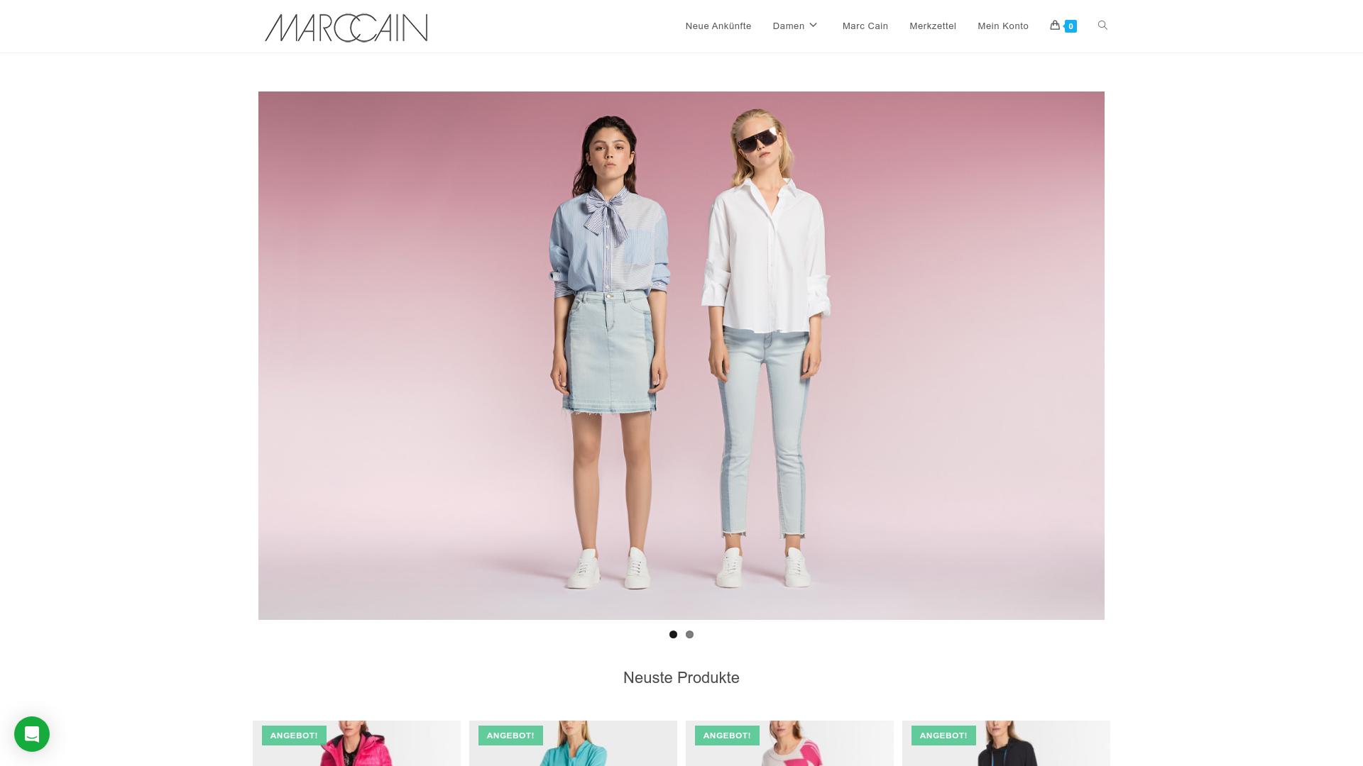 Die Webseite präsentiert sich als Online-Shop für Damenbekleidung und bietet eine Vielzahl von Modestücken an. Im oberen Bereich wird das Markenlogo angezeigt, gefolgt von einem visuellen Slider, der aktuelle Mode-Trends und neue Kollektionen zeigt. Oben auf der Seite befinden sich Navigationsbereiche, die es Nutzern ermöglichen, zwischen verschiedenen Kategorien wie „Damen“, „Marc Cain“ sowie „Neue Ankünfte“ zu wechseln. Die Hauptpräsentation der Webseite zeigt zwei Models, die verschiedene Outfits tragen, darunter ein gestreiftes Hemd und eine Jeans, in einem harmonischen rosa Farbverlauf im Hintergrund. Dies soll visuell ansprechend sein und die Kleidungsstücke inszenieren. Weiter unten auf der Seite wird ein Bereich hervorgehoben, der die neuesten Produkte anzeigt, wobei Bilder und knapp gehaltene Beschreibungen zu sehen sind. Zudem sind Schaltflächen mit dem Wort „Angebot“ angebracht, die auf Sonderaktionen oder reduzierte Items hinweisen. Diese sind klar strukturiert und ermöglichen eine einfache Navigation zu den verfügbaren Angeboten. Die Struktur der Seite legt nahe, dass Nutzer problemlos durch die verschiedenen Produktkategorien stöbern können, um gezielt nach bestimmten Artikelgruppen oder aktuellen Modetrends zu suchen. Darüber hinaus finden sich praktische Funktionen wie einen Warenkorb und ein Nutzerkonto, die es Kunden erlauben, ihre Auswahl zu speichern oder Bestellungen zu verwalten. Die Gesamtdarstellung der Webseite bietet einen klaren und modernen Look, der auf die Vorstellung von modischer Damenbekleidung abzielt und eine einfache Benutzererfahrung fördern soll. Die Seite scheint darauf ausgerichtet zu sein, den Einkäufern ein unkompliziertes Einkaufserlebnis zu bieten, mit einer klaren Fokussierung auf modische Trends und aktuelle Styles. Es werden keine spezifischen Informationen zu Zahlungsmethoden oder Versandoptionen angezeigt, die üblicherweise auf Online-Shops zu finden sind.