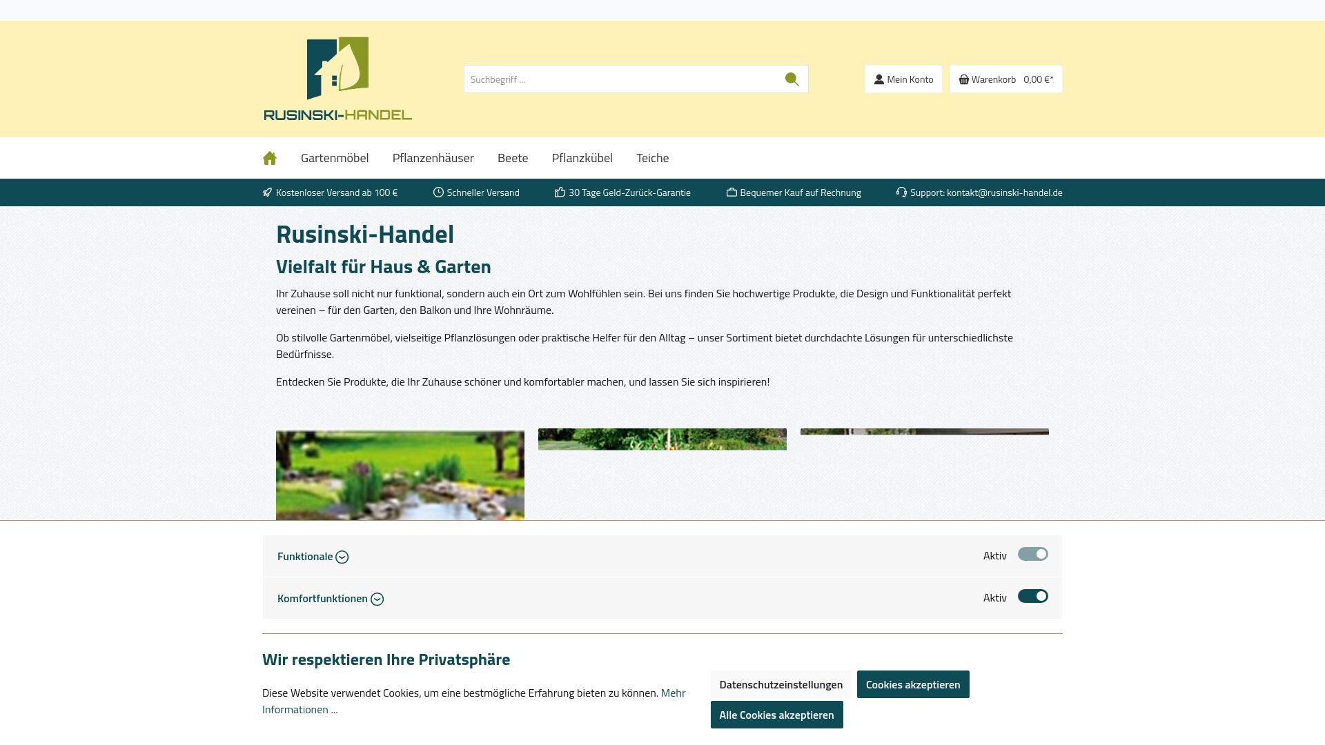 Die Webseite „Rusinski-Handel“ präsentiert sich als Anbieter von verschiedenen Produkten für Haus und Garten. Im Fokus stehen insbesondere Gartenmöbel und Pflanzlösungen, die für Balkone, Gärten und Wohnräume gedacht sind. Die Seite hebt hervor, dass die angebotenen Produkte sowohl funktionale als auch ästhetische Aspekte berücksichtigen würden. In der Sektion für Gartenmöbel werden diverse Möbelstücke angeboten, die darauf abzielen, das Zuhause als Ort des Wohlfühlens zu gestalten. Die Baureihen scheinen sowohl für den Innen- als auch für den Außenbereich geeignet zu sein und bieten eine Vielzahl von Designs und Materialien. Zusätzlich wird auf die Integration von Komfort in die Nutzung dieser Möbel hingewiesen. Ein weiterer Bereich der Webseite ist den Pflanzhäusern gewidmet. Hier finden sich möglicherweise verschiedene Lösungen zur Gartenpflege, die eine praktische Unterstützung bei der Pflanzenhaltung bieten sollen. Die Produkte könnten so konzipiert sein, dass sie auch ästhetisch ansprechend sind, um sich harmonisch in den Gartenbereich einfügen zu können. Darüber hinaus gibt es Hinweise auf Pflanzkübel, Beete und Teiche, die ebenfalls Teil des Angebots sein könnten. Der Besuch der Webseite könnte den Nutzern die Möglichkeit bieten, sich einen Überblick über verschiedene Produkte zu verschaffen, die möglicherweise zur Verschönerung der eigenen Wohn- und Gartenbereiche dienen. Der Anbieter legt Wert auf die Benutzerfreundlichkeit der Webseite, was sich in einem klaren Layout und einer strukturierten Kategorisierung der Produkte widerspiegeln könnte. Ferner wird auf den Datenschutz hingewiesen, sodass Nutzern die Möglichkeit gegeben wird, ihre Datenschutzeinstellungen anzupassen. Zusätzliche Informationen beinhalten Aspekte wie kostenloser Versand ab einem bestimmten Bestellwert, eine Geld-zurück-Garantie sowie die Option, den Kauf auf Rechnung abzuwickeln. Diese Punkte könnten für Nutzer von Interesse sein, die sich über die Kaufbedingungen informieren möchten. Insgesamt vermittelt die Webseite den Eindruck einer Plattform, die darauf abzielt, vielfältige Produkte und Lösungen für den Bereich Haus und Garten anzubieten, ohne spezifische Details zu diesen Angeboten zu vertiefen.