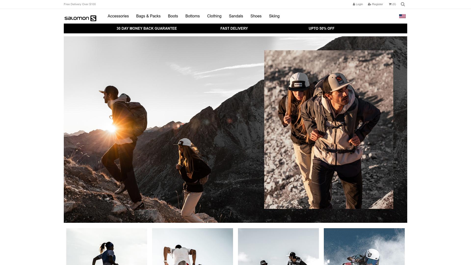 Die Webseite bietet eine Vielzahl von Outdoor-Bekleidungs- und Ausrüstungsprodukten an, die sich auf verschiedene Aktivitäten im Freien konzentrieren. Die Hauptkategorien umfassen Accessoires, Taschen, Schuhe, Bekleidung sowie spezifische Artikel für das Skifahren und Wandern. Innerhalb der Kategorie „Bekleidung“ sind unterschiedliche Produkte wie Jacken, Hosen und Shirts gelistet, die für verschiedene Wetterbedingungen und Aktivitäten geeignet sind. Die Auswahl an Schuhen umfasst spezielle Modelle für Wanderungen und sportliche Betätigungen. Auch Sandalen und andere fußgerechte Produkte sind in der Kategorie „Schuhe“ zu finden. Zusätzlich präsentiert die Seite Angebote für Zubehörartikel, die das Outdoor-Erlebnis unterstützen, wie Rucksäcke und andere Transportlösungen. Die Webseite hebt eine 30-tägige Geld-zurück-Garantie hervor, was potenziellen Käufern eine Rückgabemöglichkeit einräumt. Es gibt ebenfalls einen Hinweis auf eine schnelle Lieferung sowie Rabatte von bis zu 50%. Die Benutzeroberfläche der Webseite scheint darauf ausgelegt zu sein, ein ansprechendes Einkaufserlebnis zu bieten, mit einer visuellen Darstellung der Produkte in natürlichen Umgebungen, die das Outdoor-Thema unterstreichen. Die Bilder zeigen Personen, die die Produkte in Aktion tragen, was den Eindruck erweckt, dass die Artikel für aktive Lebensstile geeignet sind. Über diese Hauptangebote hinaus werden möglicherweise auch spezifische Kollektionen oder Sonderaktionen angezeigt, die den Nutzern Anreize zur Teilnahme geben sollen. Die Webseite zielt darauf ab, Kunden durch verschiedene Rahmenelemente, wie beispielsweise ein ansprechendes Design und informative Produktpräsentationen, eine effiziente Möglichkeit zur Auswahl und zum Kauf von Outdoor-Bekleidung und -Ausrüstung zu bieten.