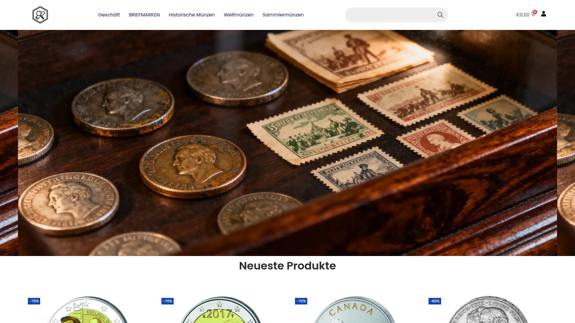 Die angegebene Webseite bietet eine Auswahl an Sammlerstücken, insbesondere in Form von Briefmarken und historischen sowie modernen Münzen. Der obere Teil der Seite präsentiert eine visuelle Darstellung, die Münzen und Briefmarken zeigt, die offensichtlich in einem Nussbaumkasten ausgestellt sind. Der Fokus liegt auf der Ästhetik der Münzen und Briefmarken, die in verschiedenen Designs und Materialien gehalten sind. Im unteren Bereich der Webseite wird eine Sektion für „Neueste Produkte“ angezeigt, in der verschiedene Artikel hervorgehoben werden. Diese Produkte umfassen Münzen aus unterschiedlichen Ländern und Epochen, und es scheint, dass einige Artikel mit prozentualen Rabatten versehen sind, die Kündigungen zu einer Signalisation von Angeboten darstellen. Die Webseite enthält außerdem Kategorien wie „Geschäft“, „Briefmarken“ und „Weltmünzen“. Diese Kategorien könnten den Nutzern helfen, gezielt nach bestimmten Arten von Numismatik oder Philatelie zu suchen. Es werden zudem spezifische historische Münzen und Sammlermünzen angeboten, was darauf hindeutet, dass die Seite eine Nische innerhalb des Marktes für Sammlerstücke anspricht. Zusammenfassend lässt sich sagen, dass die Webseite eine Plattform ist, die sich auf den Handel mit Münzen und Briefmarken spezialisiert hat, und die es Nutzern ermöglicht, durch verschiedene Kategorien von Produkten zu navigieren und Neuheiten zu entdecken. Die Gestaltung der Seite und die angebotenen Produkte sind darauf ausgelegt, Sammler und interessierte Käufer anzusprechen.