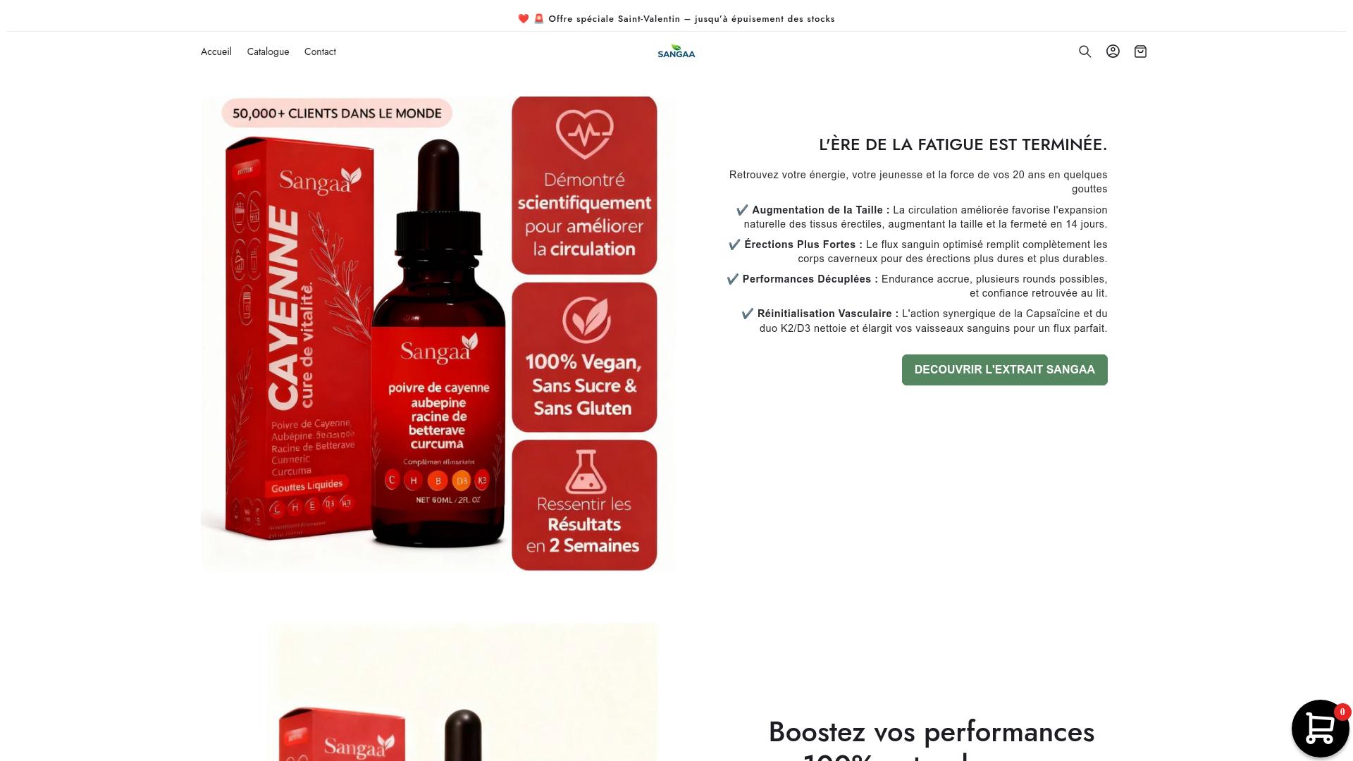Die Webseite bietet ein Produkt namens „Sangaa“ an, das als Nahrungsergänzungsmittel in flüssiger Form verkauft wird. Hauptbestandteile des Produkts sind Cayennepfeffer, die Wurzel der Rübe und Kurkuma. Die erzeugte Flüssigkeit wird als Tropfen präsentiert, die der Benutzer einnehmen kann. Die Webseite beschreibt mehrere angebliche Vorteile und Eigenschaften des Produkts. So wird betont, dass die Einnahme von Sangaa die Blutzirkulation verbessern soll, was zu verschiedenen positiven Effekten führen könnte. Diese Effekte umfassen die Unterstützung der sexuellen Leistungsfähigkeit, einschließlich der behaupteten Verbesserung der Erektionsqualität und -dauer. Des Weiteren wird erwähnt, dass die Nutzung des Produkts die allgemeine Ausdauer steigern könnte. In den Informationen auf der Seite wird darauf hingewiesen, dass das Produkt vegan ist und keine Zucker oder Gluten enthält. Diese Merkmale könnten für Verbraucher von Interesse sein, die spezielle diätetische Anforderungen haben oder allergisch auf bestimmte Inhaltsstoffe reagieren. Die Webseite legt zudem dar, dass Benutzer Ergebnisse innerhalb von zwei Wochen nach der Einnahme des Produkts erwarten könnten, und verweist auf eine „wissenschaftliche“ Grundlage für die genannten Wirkungen. Es werden Begriffe verwendet, die auf eine Verbesserung des körperlichen Wohlbefindens hinweisen, sowie auf einen potenziellen Einfluss auf das Selbstvertrauen des Nutzers. Zusätzlich zur Produktbeschreibung finden sich auf der Seite verschiedene Grafiken und Hinweise, die die Wirksamkeit des Produkts visuell und textlich unterstreichen. Die verwendete Sprache könnte darauf abzielen, eine emotionale Verbindung zum potenziellen Käufer herzustellen. Insgesamt trägt die Webseite Informationen über die Inhaltsstoffe und die angepriesenen Vorteile des Produkts bei, ohne jedoch spezifische wissenschaftliche Studien oder detaillierte Belege für die Aussagen zu präsentieren. Es wird eine „Sonderaktion“ erwähnt, die möglicherweise zeitlich begrenzt ist und dazu dient, das Interesse und die Handlungsbereitschaft seitens der Nutzer zu fördern. Die Produktseite bietet ebenfalls eine Möglichkeit, mehr Informationen über das Produkt sowie einen direkten Kauf der Tropfen zu initiieren.