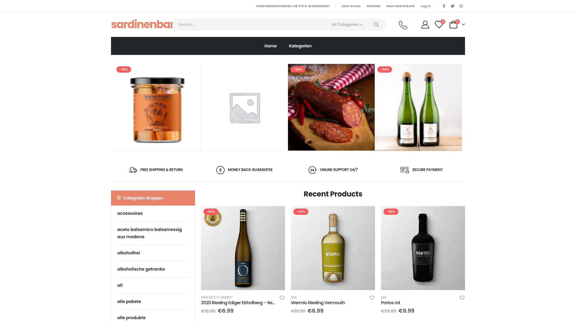 Die Webseite „sardinenbal“ bietet eine Vielzahl von Lebensmittelprodukten, die online zum Kauf verfügbar sind. Die Hauptkategorien der angebotenen Produkte umfassen Delikatessen wie eingelegte Produkte, Wurstwaren und alkoholische Getränke. Auf der Seite wird eine Auswahl an verschiedenen Artikeln angezeigt, die in mehreren Kategorien organisiert sind. Besondere Merkmale der Webseite sind Preisreduzierungen, die für einige Produkte angezeigt werden, sowie Hinweistexte wie „Kostenloser Versand & Rückgabe“, „Geld-zurück-Garantie“ und „24/7 Online-Support“. Diese Hinweise sind im oberen Bereich der Webseite platziert und sollen potenzielle Käufer ansprechen. Im dargestellten Sortiment finden sich unter anderem ein Glas mit eingelegten Karotten, eine Wurst, die möglicherweise als Regionalspezialität gilt, und Flaschen mit alkoholischen Getränken wie Riesling und Vermouth. Die Preisgestaltung zeigt teils signifikante Rabatte im Vergleich zu ursprünglichen Preisen, was darauf hindeutet, dass es sich um Angebote handeln könnte, die Kunden anziehen sollen. Die Struktur der Webseite ermöglicht es Nutzern, durch verschiedene Produktkategorien zu navigieren. Zu den Kategorien gehören unter anderem „Zubehör“, „alkoholfreie Getränke“ und „alkoholische Getränke“. Jede Kategorie beherbergt diverse Produkte, die detaillierte Informationen über Preise und Verfügbarkeit bereitstellen. Zusammenfassend lässt sich sagen, dass „sardinenbal“ eine Plattform ist, die verschiedene Lebensmittelprodukte, insbesondere Delikatessen und alkoholische Getränke, anbietet und verschiedene Verkaufsmerkmale nutzt, um den Online-Einkaufsprozess zu unterstützen.