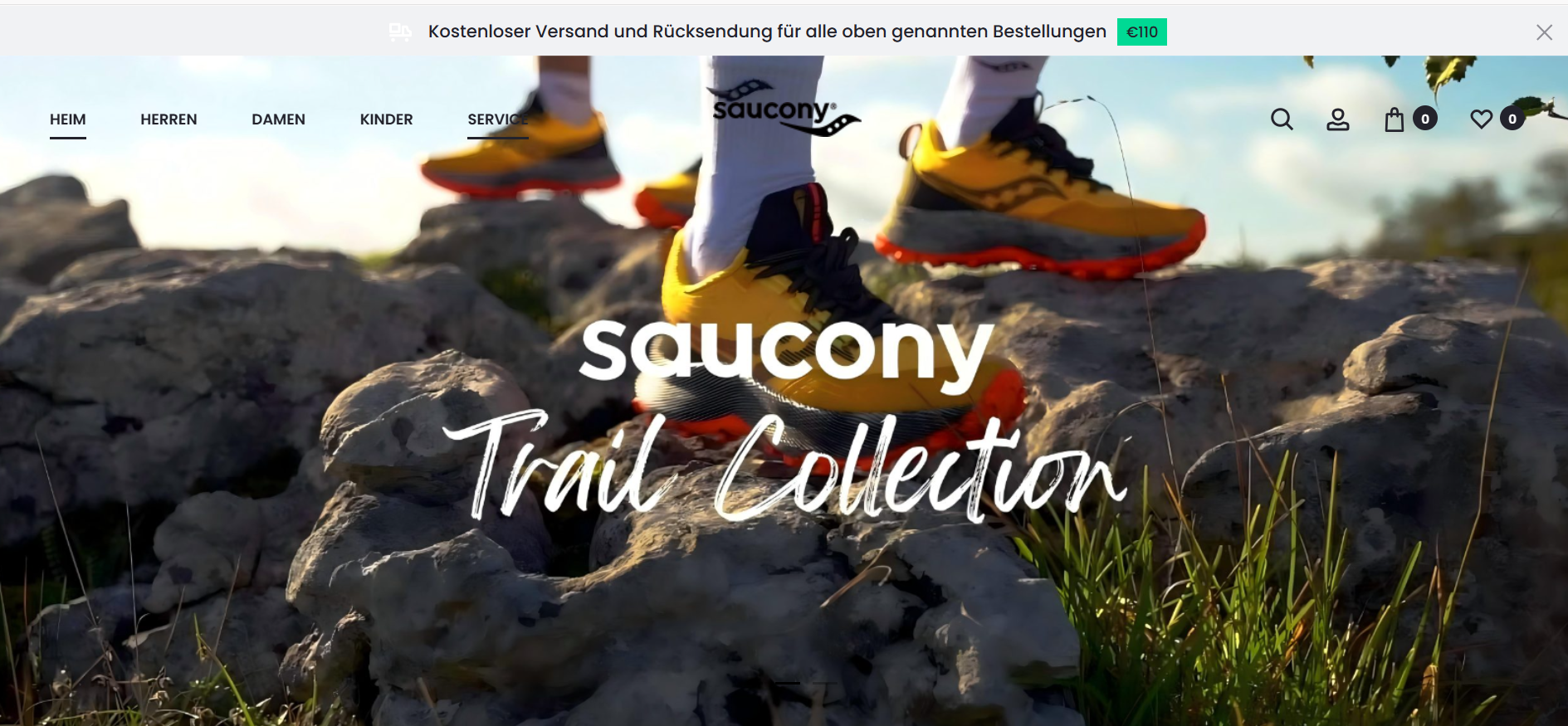 Die Webseite bietet eine Auswahl von Produkten der Marke Saucony, die sich auf Lauf- und Sportschuhe spezialisiert hat. Auf der Startseite wird eine „Trail Collection“ beworben, die eine Reihe von Schuhen umfasst, die für das Laufen im Gelände gedacht sind. Die visuelle Darstellung auf der Seite zeigt diese Schuhe in einer naturnahen Umgebung, was darauf hinweist, dass die Produkte in einem Outdoor-Kontext verwendet werden können. Das Menü der Webseite enthält Kategorien für verschiedene Zielgruppen, darunter „Heim“, „Herren“, „Damen“ und „Kinder“, was darauf hindeutet, dass das Produktangebot sowohl für Erwachsene als auch für Kinder ausgelegt ist. Diese Kategorisierung ermöglicht eine einfache Navigation und eine gezielte Suche nach spezifischen Produkten. Zusätzlich wird ein Servicebereich angeboten, der möglicherweise Informationen zu Rücksendungen, Kundenservice oder Anfragen enthält. Auf der Webseite wird auch auf kostenlosen Versand und Rücksendungen für bestimmte Bestellungen hingewiesen, was für potenzielle Käufer von Interesse sein könnte. Die Präsentation der Produkte ist kombiniert mit einer ansprechenden visuellen Gestaltung, um das Interesse der Nutzer zu wecken. Die Webseite scheint darauf abzuzielen, eine benutzerfreundliche Erfahrung zu bieten, indem sie eine gut strukturierte Menüführung und klare Informationen zu den verfügbaren Produkten bereitstellt. Die dargestellten Schuhe und eventuell weitere Ausrüstungsgegenstände werden visuell präsentiert und könnten in unterschiedlichen Farben und Modellen angeboten werden. Hinweise auf spezielle Angebote oder Rabatte könnten ebenfalls verfügbar sein, auch wenn diese im dargestellten Screenshot nicht ersichtlich sind. Zusammenfassend bietet die Webseite eine Übersicht über die Produktlinien der Marke Saucony, mit einem Fokus auf Lauffreunde und Outdoor-Enthusiasten, und ermöglicht den Nutzern eine einfache Suche nach geeigneten Produkten für verschiedene Altersgruppen.