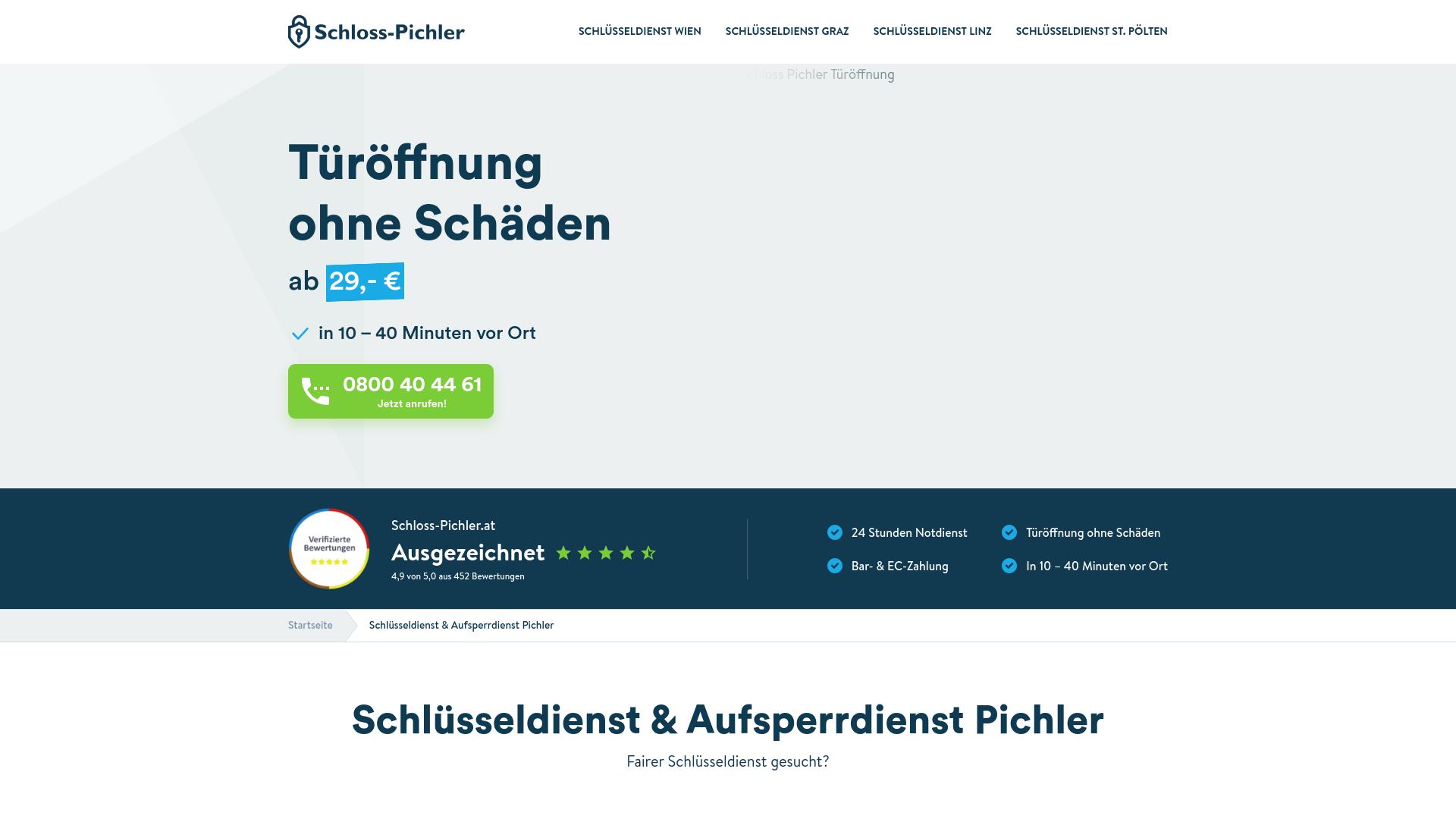 Die Webseite „Schloss-Pichler“ bietet Dienstleistungen im Bereich Schlüsseldienst und Aufsperrdienst an. Sie ist darauf ausgelegt, Kunden Unterstützung bei Türöffnungen zu bieten, insbesondere in Notfällen. Laut den Angaben auf der Seite beginnt der Preis für eine Türöffnung bei 29 Euro. Zudem wird erwähnt, dass die Anfahrt und Arbeitszeit zwischen 10 und 40 Minuten in Anspruch nehmen kann. Unter den angebotenen Dienstleistungen wird ausgeführt, dass die Türöffnungszeiten so gestaltet sind, dass sie das Öffnen von Türen ohne Schäden ermöglichen. Das könnte für Kunden interessant sein, die beispielsweise aus Gründen der Sicherheit oder der Ästhetik eine beschädigungsfreie Öffnung wünschen. Darüber hinaus wird betont, dass der Dienst rund um die Uhr verfügbar ist, was darauf hindeutet, dass Kunden jederzeit Unterstützung in Anspruch nehmen können. Ein Hinweis auf die Bezahlmethoden deutet darauf hin, dass sowohl Bar- als auch EC-Zahlungen akzeptiert werden. Dies könnte für potenzielle Kunden von Bedeutung sein, die verschiedene Zahlungsmodalitäten bevorzugen. Die Webseite weist auch auf gesonderte Seiten für verschiedene Städte hin, was darauf hindeutet, dass der Dienst in mehreren geografischen Regionen, wie Wien, Graz, Linz und St. Pölten, dauerhaft angeboten wird. Zudem gibt es Informationen über „verifizierte Bewertungen“ auf der Webseite, die eine Bewertung von 4,9 von 5,0 aus 452 Bewertungen anzeigt. Dies könnte darauf hinweisen, dass die Erfahrungen anderer Kunden auf der Webseite gesammelt und präsentiert werden, um deren Zufriedenheit widerzuspiegeln. Die Benutzeroberfläche der Seite führt den Nutzer durch verschiedene Dienstleistungen und bietet eine Kontaktmöglichkeit zur schnellen Erreichbarkeit des Dienstleisters an. Der deutlich abgegrenzte Button für einen telefonischen Kontakt kann es den Nutzern erleichtern, bei Bedarf umgehend Unterstützung zu suchen. Zusammenfassend erlaubt die Webseite „Schloss-Pichler“ den Nutzern, gezielt Informationen zu Schlüsseldienstleistungen abzurufen, Preise zu vergleichen und unmittelbare Hilfe in Notfällen anzufordern.