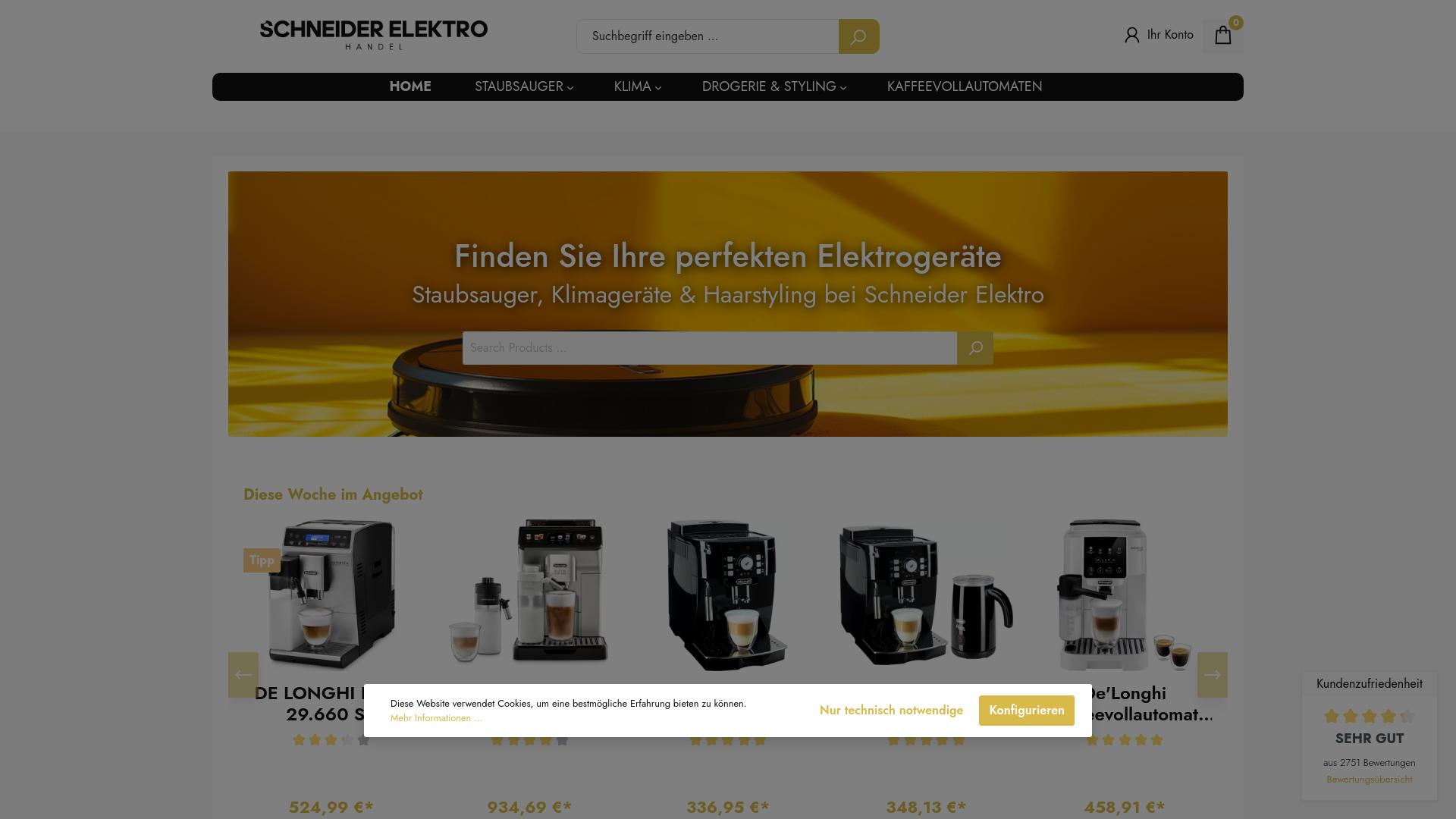 Die Webseite „Schneider Elektro“ bietet eine Auswahl an verschiedenen Elektrogeräten, insbesondere für den Haushalt. Die Hauptkategorien der Produkte umfassen Staubsauger, Klimageräte, Drogerie- und Stylingprodukte sowie Kaffeevollautomaten. Im oberen Bereich der Seite wird ein Suchfeld angezeigt, über das Nutzer gezielt nach Produkten suchen können. Unterhalb des Suchfeldes gibt es eine visuelle Darstellung von aktuellen Angeboten, die verschiedene Modelle von Kaffeevollautomaten zeigt. Diese werden mit Preisangaben in Euro vorgestellt, zusammen mit den spezifischen Modellbezeichnungen. Die Seite verwendet eine gelbe Farbpalette, die in der Gestaltung der hinteren Bereiche und der Schriftlinien dominiert, und richtet sich offensichtlich an Verbraucher, die an Elektrowaren interessiert sind. Es werden Informationen zu den Produkten bereitgestellt, die typischerweise Fotos, Preisangaben und eventuell technische Details umfassen. Einige Artikel werden als „Tipp“ hervorgehoben und erhalten größere Einsatzbilder. Zusätzlich wird auf eine Funktion hingewiesen, die es den Nutzern erlaubt, die Produkte zu konfigurieren, was möglicherweise auf anpassbare Optionen bezüglich bestimmter Geräte hinweist. Dies könnte für Kaffeevollautomaten von Bedeutung sein, die oft unterschiedliche Einstellungen und Zubehörteile bieten. An der rechten Seite der Webseite wird eine Bewertung angezeigt, die durch Nutzerrezensionen zustande gekommen ist. Diese zeigt eine durchschnittliche Zufriedenheitseinwertung von „sehr gut“ basierend auf über 2700 Bewertungen. Diese Art der Darstellung könnte dazu dienen, potenziellen Käufern einen Eindruck von der allgemeinen Nutzererfahrung zu vermitteln. Die Webseite nutzt Cookies, um die Benutzererfahrung zu optimieren, wobei Nutzer informiert werden, dass sie die Cookie-Einstellungen anpassen können. Insgesamt konzentriert sich die Webseite auf den Verkauf von Elektrogeräten und könnte als Anlaufstelle für Kunden dienen, die solche Produkte suchen. Es werden keine weiteren Informationen über Rückgabebedingungen, Garantiezeiten oder Zahlungsmethoden in dem angegebenen Screenshot dargestellt.