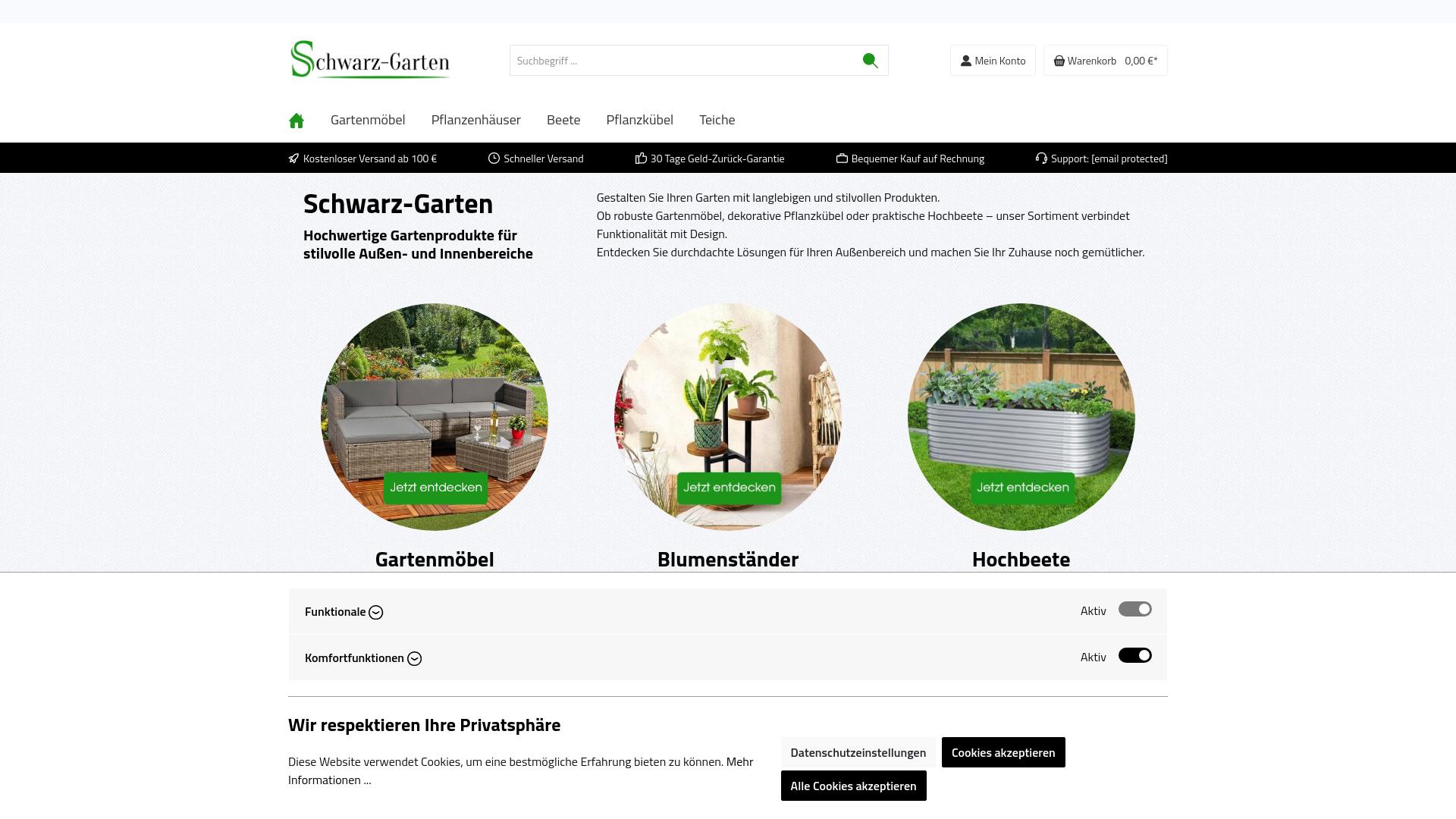 Die Webseite „Schwarz-Garten“ bietet eine Auswahl an Gartenprodukten, die für die Gestaltung von Außen- und Innenbereichen konzipiert sind. Zu den Hauptkategorien gehören Gartenmöbel, Blumenständer und Hochbeete. Im Bereich Gartenmöbel werden verschiedene Produkte präsentiert, die sowohl funktionale als auch komfortable Merkmale aufweisen. Hierzu zählen Sitzmöbel und Tische, die für den Einsatz im Freien gedacht sind. Die Produktbeschreibung umfasst oft Aspekte des Designs und der Multifunktionalität. Die Kategorie Blumenständer bietet dekorative Lösungen zur Präsentation von Pflanzen. Diese Produkte scheinen darauf ausgelegt zu sein, eine ansprechende Gestaltungsebene für verschiedene Pflanzentypen zu schaffen, sowohl im Innen- als auch im Außenbereich. Hochbeete gehören ebenfalls zum Sortiment der Webseite. Diese sind für die Anpflanzung von Gemüse und Blumen konzipiert. Sie sind in unterschiedlichen Materialien und Größen erhältlich, um verschiedenen Gartenbedürfnissen gerecht zu werden. Zusätzlich zu den Produktkategorien enthält die Webseite Informationen zu Lieferbedingungen, einschließlich eines kostenlosen Versands ab einem bestimmten Bestellwert. Es wird auch auf eine Geld-Zurück-Garantie hingewiesen, die eine Rückgabe innerhalb von 30 Tagen gestattet. Die Webseite verwendet Cookies, um die Nutzererfahrung zu optimieren und bietet eine Datenschutzerklärung an, die den Besuchern weitere Informationen zur Datenverarbeitung bereitstellt. Ein Abschnitt informiert die Nutzer über Möglichkeiten zur Anpassung von Cookie-Einstellungen. Die Benutzeroberfläche ist darauf ausgelegt, eine einfache Navigation durch das Sortiment zu ermöglichen, wobei relevante Informationen zu den Produkten bereitgestellt werden. Ein Schnellsuche-Funktion erleichtert es den Nutzern, gezielt nach bestimmten Artikeln zu suchen. Insgesamt vermittelt die Webseite „Schwarz-Garten“ eine umfassende Produktpräsentation, die darauf abzielt, eine Auswahl für Gartenanwendungen anzubieten, ohne eine spezifische Ausrichtung in Bezug auf die Nutzerwahrnehmung oder eine besondere Vertrauenswürdigkeit der Angebote zu implizieren.