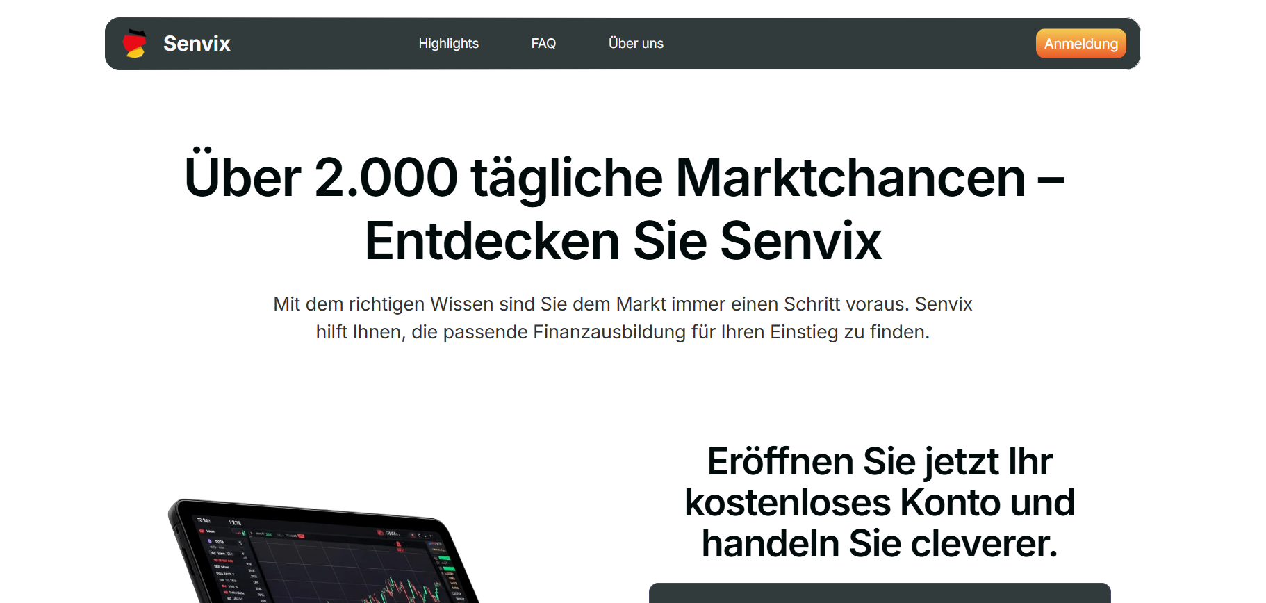 Die Webseite Senvix bietet Nutzern die Möglichkeit, sich über verschiedene Finanzbildungsangebote zu informieren. Der Hauptfokus liegt auf der Identifikation von Marktchancen, wobei täglich über 2.000 solcher Chancen hervorgehoben werden. Dies geschieht durch Bereitstellung von Informationen, die den Nutzern helfen, die Märkte besser zu verstehen und geeignete Strategien für Investitionen zu entwickeln. Ein herausgestelltes Merkmal der Webseite ist die Aufforderung zur Kontoeröffnung, welche als kostenlos bezeichnet wird. Dies deutet darauf hin, dass Nutzer ein Konto anlegen können, um Zugang zu den angebotenen Dienstleistungen zu erhalten. Der Dienst scheint darauf ausgelegt zu sein, den Nutzern dabei zu helfen, ihre Finanzkenntnisse zu erweitern und fundierte Entscheidungen zu treffen, indem sie Unterstützung beim Lernen über den Handel und die Finanzmärkte erhalten. Zusätzlich enthält die Webseite einen Bereich für häufig gestellte Fragen (FAQ), wo Nutzer Antworten auf eventuell auftretende Fragen finden können. Die Seite vermittelt den Eindruck, dass sie eine Plattform ist, die sich auf die Unterstützung von Nutzern konzentriert, die in den Finanzmarkt einsteigen möchten. In der visuellen Darstellung der Webseite wird ein Bild eines digitalen Handelstools abgebildet, was darauf hinweist, dass Nutzer wahrscheinlich Zugang zu technologischen Hilfsmitteln oder Plattformen erhalten, um ihren Handel zu erleichtern. Diese Aspekte werden zusammengeführt, um ein Gesamtbild zu schaffen, das anzeigt, dass die Webseite Informationen und Ressourcen für interessierte Nutzer bereitstellt. Die Webseite bietet somit eine Vielzahl von Elementen, die darauf abzielen, den Nutzern zu helfen, sich im Finanzmarkt besser zurechtzufinden, ohne jedoch spezifische Details zu den angebotenen Dienstleistungen oder deren Beschränkungen zu nennen.