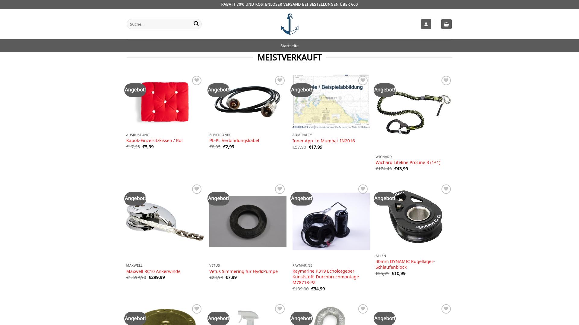 Die Webseite bietet eine Vielzahl von Produkten, die hauptsächlich auf maritime Ausrüstung und Zubehör fokussiert sind. Auf der Hauptseite sind verschiedene Artikel aufgeführt, die als „Meistverkauft“ gekennzeichnet sind. Unter den angezeigten Produkten befinden sich unter anderem ein Kapok-Einzelkissen in Rot, das für €5,99 angeboten wird, und ein PL-PL Verbindungs-kabel, dessen Preis bei €2,99 liegt. Zusätzlich werden nautische Karten angeboten, wie beispielsweise eine Seekarte mit dem Titel „Inner App. to Mumbai. IN2016“ für €17,99. Des Weiteren wird eine Maxwell RC10 Ankerwinde zum Preis von €299,99 angezeigt, die regulär €699,99 gekostet hat, was auf einen Rabatt hinweist. Weitere Produkte umfassen Artikel wie Dichtungsringe für hydraulische Pumpen, die für €7,99 erhältlich sind, sowie Echolotgeräte für €34,99. Verschiedene andere maritime Zubehörteile, darunter ein 40 mm DYNAMIC Kugellager-Schnelllaufblock, sind ebenfalls verfügbar. Die Produkte sind durchgängig mit Preisen versehen, die entweder regulär oder im Rahmen von Sonderangeboten angezeigt werden. Einige dieser Artikel präsentieren einen deutlichen Preisnachlass, was auf eine Verkaufsstrategie hinweisen könnte, um potenzielle Käufer anzuziehen. Die Webseite bietet eine Suchfunktion sowie eine Kategorieauswahl, die es den Nutzern ermöglicht, gezielt nach bestimmten Artikeln zu suchen. Diese Auswahl an Produkten könnte sich hauptsächlich an Freizeit- und Berufsnutzer mit maritimen Interessen richten. Insgesamt ist die Webseite klar strukturiert, und die angebotenen Produkte decken ein breites Spektrum im Bereich der maritimen Ausrüstung und Zubehör ab. Der Fokus liegt auf funktionalen Artikeln, die für Einsätze auf dem Wasser geeignet sind.