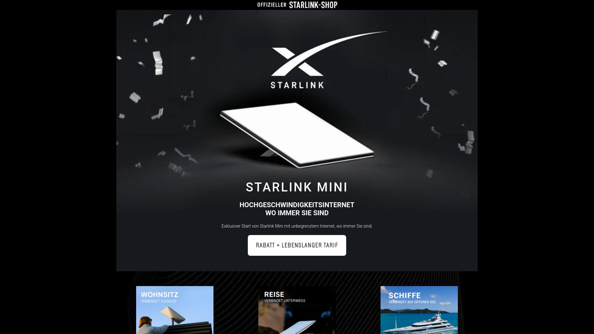 Die Webseite bietet eine Produktlinie namens „Starlink Mini“ an, die sich auf Hochgeschwindigkeitsinternet fokussiert. Das Internetangebot wird als unlimitiert beschrieben und zielt darauf ab, Nutzern eine Verbindung unabhängig von ihrem Standort zu ermöglichen. Die Startseite hebt die Vorteile des „Starlink Mini“-Systems hervor, das vermutlich eine Komponente des Starlink-Satelliteninternetdienstes darstellt, und bietet einen klaren Call-to-Action in Form eines Rabatts sowie der Möglichkeit eines lebenslangen Tarifs an. Außerdem sind verschiedene Anwendungsbereiche aufgeführt, in denen der Internetdienst eingesetzt werden kann, darunter Wohnsitze, Reisen und Schifffahrt. Im Abschnitt „Wohnen“ wird darauf hingewiesen, dass das Produkt dazu verwendet werden kann, um in Wohnräumen eine Internetverbindung herzustellen. Der Bereich „Reise“ thematisiert die Möglichkeit, auch unterwegs eine Verbindung herstellen zu können, was für Reisende oder Personen, die häufig unterwegs sind, von Bedeutung sein könnte. Der Abschnitt „Schiffe“ adressiert die Verwendung des Dienstes auf Wasserfahrzeugen und beschreibt potenzielle Anwendungsfälle auf hoher See. Die Webseite ist visuell so gestaltet, dass sie einen modernen und technologischen Eindruck vermittelt, wobei vorwiegend dunklere Farbtöne und eine klare Schriftart verwendet werden. Die Benutzeroberfläche scheint darauf abzuzielen, Informationen über die Vorteile und Funktionen des Starlink Mini-Systems einfach und schnell zugänglich zu gestalten. Insgesamt handelt es sich um eine Plattform, die auf die Vermarktung von Satelliteninternetdiensten fokussiert ist, mit einer klaren Benutzerführung und einem Angebot, das Nutzern unlimitierte Internetlösungen in verschiedenen Lebenssituationen präsentieren möchte.