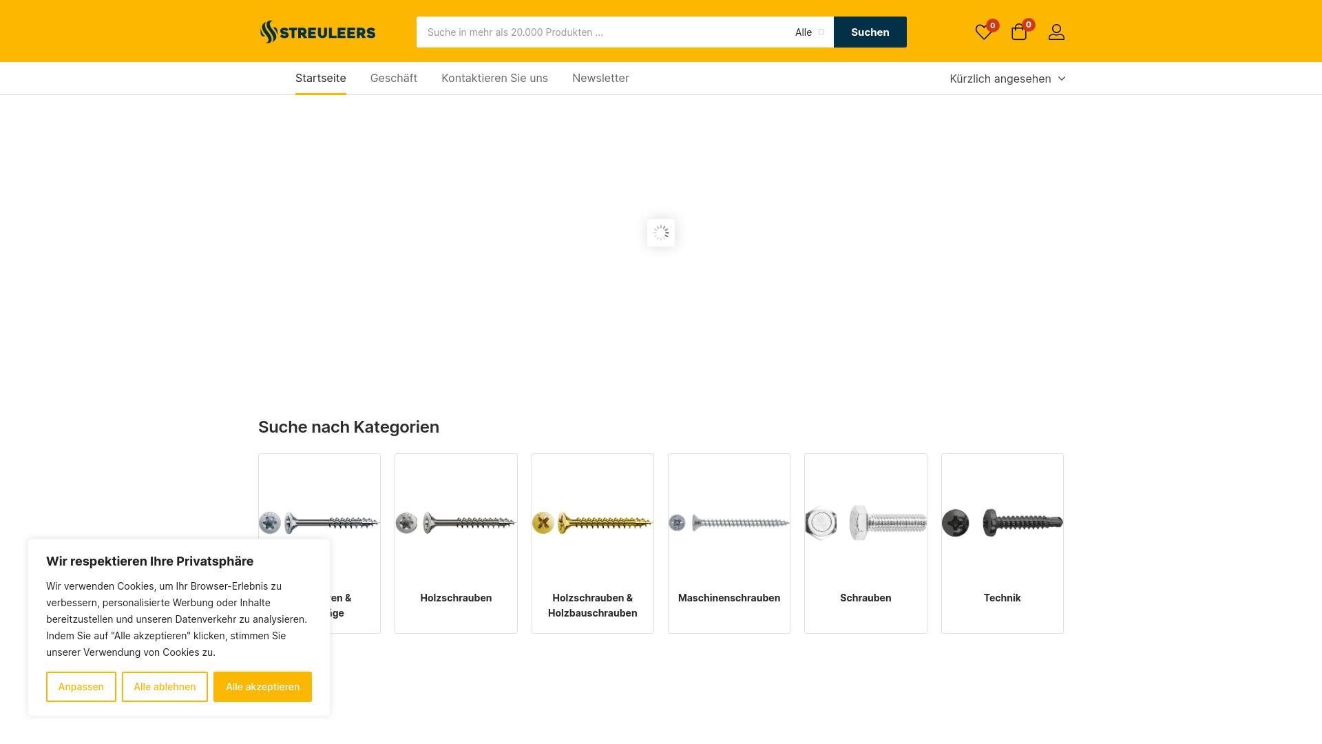 Die Webseite, die in dem Screenshot dargestellt ist, bietet eine Auswahl an verschiedenen Schrauben und Verbindungselementen an. Im oberen Bereich der Seite befindet sich eine Suchfunktion, über die Nutzer nach mehr als 20.000 Produkten suchen können. Unter dem Menüpunkt „Suche nach Kategorien“ sind mehrere Kategorien aufgeführt, die spezifische Arten von Schrauben anzeigen. Dazu gehören „Holzschrauben“, „Holzschrauben & Holzbauschrauben“, „Maschinenschrauben“, „Schrauben“ und „Technik“. Diese Kategorien ermöglichen es den Nutzern, gezielt nach bestimmten Arten von Schrauben zu suchen, die ihren Anforderungen entsprechen. Die Webseite scheint auf eine klare und funktionale Benutzerführung ausgelegt zu sein, mit einer intuitiven Anordnung der angebotenen Produkte. Es ist auch ein Hinweis auf die Verwendung von Cookies vorhanden, der die Nutzer darüber informiert, dass ihre Browser-Erfahrung durch Cookies verbessert wird. Den Nutzern wird die Möglichkeit gegeben, ihre Zustimmung zur Verwendung von Cookies anzupassen oder abzulehnen. Insgesamt konzentriert sich die Webseite auf den Verkauf von Schrauben und verwandten Produkten, wobei eine strukturierte Navigation und kategorisierte Angebote zur Verfügung gestellt werden. Kunden können durch diese Kategorien stöbern, um die gewünschten Artikel zu finden.