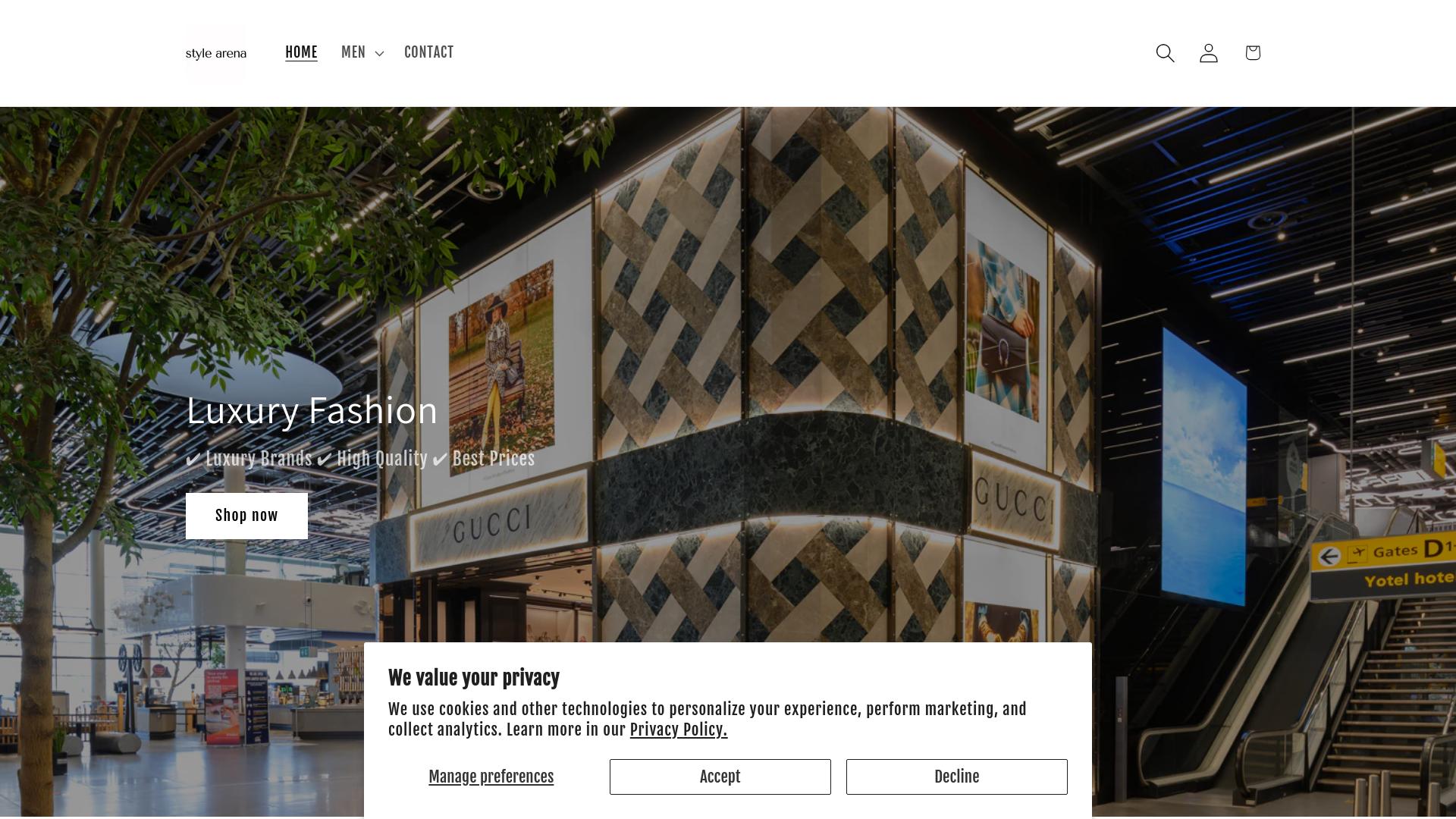 Die Webseite „style arena“ präsentiert sich als Plattform, die Luxusmode anbietet. Auf der Startseite wird der Fokus auf die Absatzmärkte für Luxusmarken gelegt. Die Seite hebt hervor, dass sie Produkte von hochklassigen Marken führen und eine breite Auswahl an Artikeln bietet. Die Inhalte deuten darauf hin, dass die angebotenen Produkte als von hoher Qualität angesehen werden können und dass sie zu den besten Preisen erhältlich sind. Es wird ein klarer Aufruf zur Aktion gegeben, indem Nutzer direkt auf einen Button mit der Aufschrift „Shop now“ klicken können, um die verfügbaren Produkte einzusehen oder zu erwerben. Die Navigation scheint einfach gestaltet zu sein, mit einem Abschnitt „MEN“, der möglicherweise spezifische Produkte für Männer anzeigt, und einem „CONTACT“-Bereich, der für die Kontaktaufnahme mit dem Anbieter gedacht ist. Die visuelle Gestaltung der Webseite vermittelt ein modernes und ansprechendes Ambiente, was durch die Verwendung von hochwertigen Bilder und ansprechendem Design unterstrichen wird. Auf der Seite sind auch Hinweise auf bekannte Luxusmarken wie Gucci zu sehen, was darauf hinweist, dass das Angebot möglicherweise Markenkleidung oder Accessoires umfasst. Zusätzlich enthält die Webseite einen Hinweis auf Datenschutz, der darauf hindeutet, dass Cookies verwendet werden, um das Nutzererlebnis zu personalisieren und Analysen durchzuführen. Informationen über die Verwendung von Datenschutzpraktiken sind ebenfalls auf der Seite zu finden, einschließlich eines Links zur Datenschutzerklärung. Insgesamt stellt die Webseite eine Plattform dar, die sich auf den Verkauf von Luxusmode spezialisiert hat, mit Angeboten, die für Kunden, die an hochwertigen Marken interessiert sind, von Interesse sein könnten. Die Struktur der Webseite legt nahe, dass sie auf eine zielgerichtete Nutzererfahrung abzielt, wobei der Zugang zu Informationen und Produkten klar und direkt gestaltet ist.