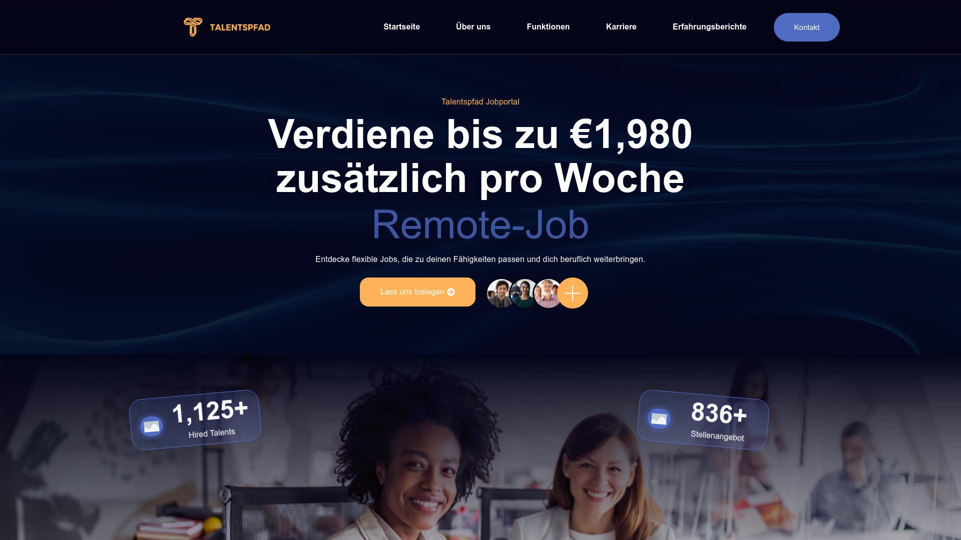 Die Webseite „Talentspfad“ präsentiert sich als Jobportal, das insbesondere remote Arbeitsmöglichkeiten anbietet. Die Hauptbotschaft der Seite ist die Aussicht, von zu Hause aus bis zu 1.980 Euro zusätzlich pro Woche zu verdienen. Dies wird durch die Entdeckung flexibler Arbeitsmöglichkeiten unterstützt, die anscheinend an die individuellen Fähigkeiten der Nutzer angepasst sind. Auf der Startseite werden Nutzer dazu angeregt, sich anzumelden, um passende Jobangebote zu finden. Die Plattform hebt hervor, dass eine Vielzahl von Funktionen bereitgestellt wird, um den Nutzern bei der Auswahl ihrer Karriereweg zu helfen. Dazu gehört die Möglichkeit, aus einer Liste von über 836 Stellenangeboten zu wählen, die zu den Interessens- und Fähigkeitsprofilen der Nutzer passen. Des Weiteren wird angegeben, dass mehr als 1.125 Talente bisher über die Plattform erfolgreich eingestellt wurden. Die Webseite umfasst ebenfalls Links zu weiteren Bereichen wie „Über uns“, „Funktionen“, „Karriere“ und „Erfahrungsberichten“, wobei diese Bereiche zusätzliche Informationen über die Plattform und die angebotenen Dienstleistungen bereitstellen könnten. Die Gestaltung der Seite ist modern, mit einer dunklen Farbpalette und ansprechenden Bildern, die eine berufliche Umgebung zeigen. Insgesamt konzentriert sich die Webseite darauf, Nutzern zu helfen, zusätzliche Einkommensquellen durch flexible Arbeitsmöglichkeiten zu finden, die in einem Remote-Setup ausgeführt werden können. Die genauen Arten von Jobs, die angeboten werden, und die Modalitäten dieser Anstellungen sind jedoch auf der Startseite nicht detailliert beschrieben, was Nutzer möglicherweise dazu anregt, weitere Informationen einholen zu wollen.