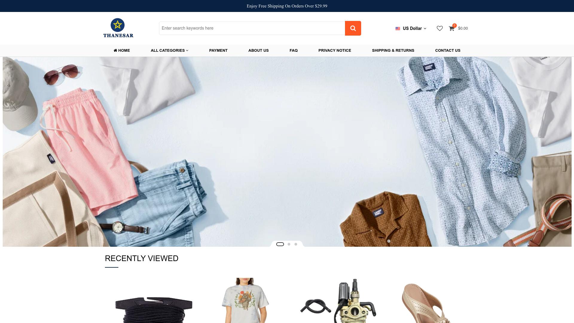 Die Webseite „thanesar.com“ bietet eine Auswahl an Bekleidungsartikeln und Accessoires für verschiedene Anlässe und Wetterbedingungen an. Auf der Hauptseite sind verschiedene Textilien abgebildet, die typischerweise für Freizeit- oder Sportnutzung geeignet sind. Dazu zählen unter anderem kurze Hosen, T-Shirts, Poloshirts, Hemden und Flip-Flops. Die Farben und Designs der Kleidungsstücke scheinen variabel und richten sich wahrscheinlich an unterschiedliche Geschmäcker und Vorlieben. Des Weiteren wird auf der Webseite auf eine Auswahl an Taschen hingewiesen, welche insbesondere für den täglichen Gebrauch oder für Freizeitaktivitäten konzipiert zu sein scheinen. Es scheint eine Vielzahl von Stilen zu geben, die sich sowohl für Männer als auch für Frauen eignen. Die Seite enthält eine Suchfunktion, die es Nutzern ermöglicht, spezifische Produkte zu finden. Zudem sind Menüoptionen vorhanden, die es ermöglichen, verschiedene Kategorien von Artikeln zu durchstöbern. Über die Kategorien kann der Kunde gezielte Angebote erkunden, darunter vermutlich spezielle Aktionen oder Neuheiten. Im oberen Bereich der Seite wird auf ein kostenloses Versandangebot hingewiesen, das bei Bestellungen über einem bestimmten Wert gilt. Des Weiteren finden sich Links zu Informationen über Zahlungsmöglichkeiten, eine FAQ-Sektion, Datenschutzbestimmungen, Informationen zu Versand und Rückgaben sowie zu einem Kontakformular, welches den Nutzern ermöglicht, Unterstützung oder weitere Informationen zu suchen. Die auf der Webseite gezeigten Artikel scheinen unterschiedliche Preisklassen abzudecken, was auf eine vielseitige Kundenansprache hinweisen könnte. Diese Vielfalt könnte es den Nutzern ermöglichen, je nach persönlichem Budget und bevorzugtem Stil zu wählen. Zusammenfassend präsentiert die Webseite eine Vielzahl von Bekleidungs- und Accessoires-Angeboten, die sich an verschiedenen Zielgruppen orientieren und vielseitige Optionen für Freizeitgestaltung und Alltag bieten.