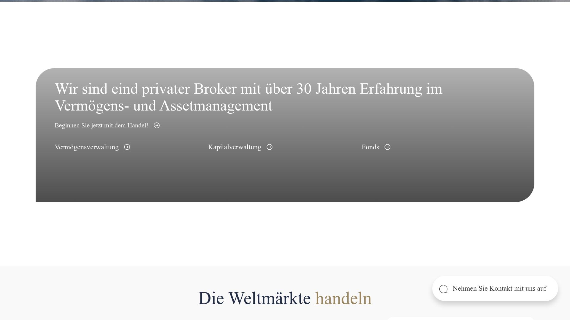 Die Webseite präsentiert sich als Plattform für Vermögens- und Assetmanagement, die sich als privater Broker mit über 30 Jahren Erfahrung in diesem Bereich positioniert. Auf der Startseite wird Nutzern die Möglichkeit angeboten, mit dem Handel zu beginnen. Es werden verschiedene Dienstleistungen im Bereich der Vermögensverwaltung, Kapitalverwaltung und Fondsangelegenheiten angepriesen. Im Detail wird auf die Vermögensverwaltung eingegangen, wobei Informationen zu den angebotenen Strategien und Dienstleistungen fehlen. Der Bereich der Kapitalverwaltung wird ebenso erwähnt, jedoch sind keine spezifischen Dienstleistungen oder Ansätze aufgeführt. Die Webseite legt auch einen Fokus auf die Möglichkeit, in Fonds zu investieren, ohne dabei weiter ins Detail zu gehen, welche Fundamente oder Arten von Fonds tatsächlich angeboten werden. Im unteren Bereich der Seite wird auf die weltweiten Märkte verwiesen, wobei der Geltungsbereich und die spezifischen Märkte, die abgedeckt werden, unklar bleiben. Die Webseite enthält mehrere Handlungsempfehlungen, beispielsweise zur Kontaktaufnahme, ohne jedoch genaue Informationen zu den verfügbaren Kontaktmöglichkeiten oder zur Unternehmensstruktur zuteilen. Die visuelle Gestaltung der Webseite ist einfach gehalten, mit einem übersichtlichen Layout und klaren Handlungsaufforderungen an die Nutzer, sich zu registrieren oder Kontakt aufzunehmen. Es sind keine spezifischen Informationen zu Gebühren, rechtlichen Hinweisen oder Anlegerwarnungen zu finden. Dies könnte für potenzielle Nutzer relevant sein, da solche Informationen oft entscheidend sind, um ein vollumfängliches Bild der angebotenen Dienstleistungen zu erhalten. Insgesamt bietet die Webseite eine knappe Darstellung ihrer Dienstleistungen, wobei ein eindeutiges Bieterspektrum nicht erkennbar ist. Details zu den spezifischen Leistungen, Risikohinweisen oder etwaigen Anmeldeprozessen sind nicht explizit aufgeführt, was möglicherweise weitere Informationen erforderlich macht, um eine informierte Entscheidung zu treffen.